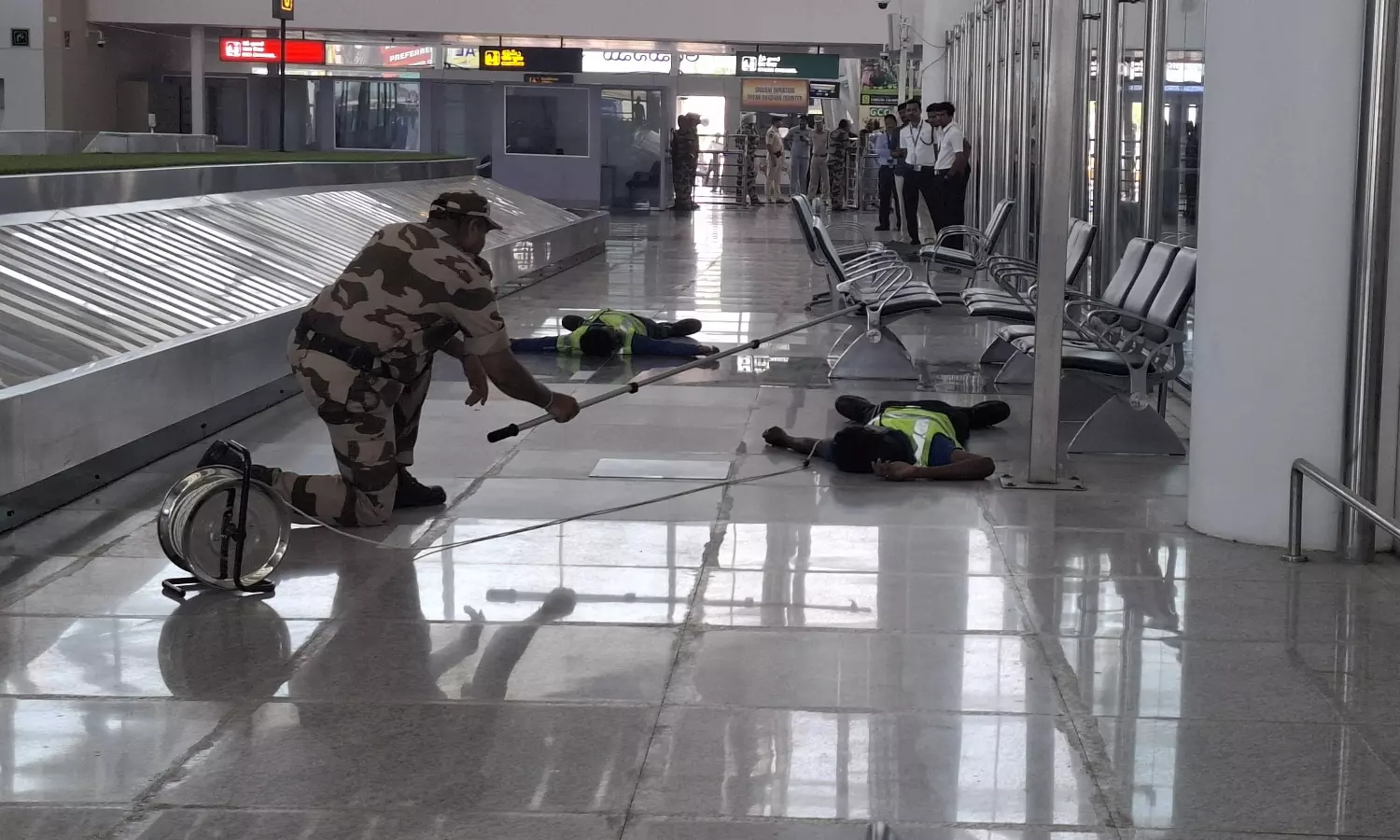 At 10.58 am, a second drill began at Renigunta International Airport, where four armed assailants simulated the role of terrorists. Two entered via the International Arrival Gate, opening fire on civilians, and two entered through the old vehicle gate, taking cover near the fire station.