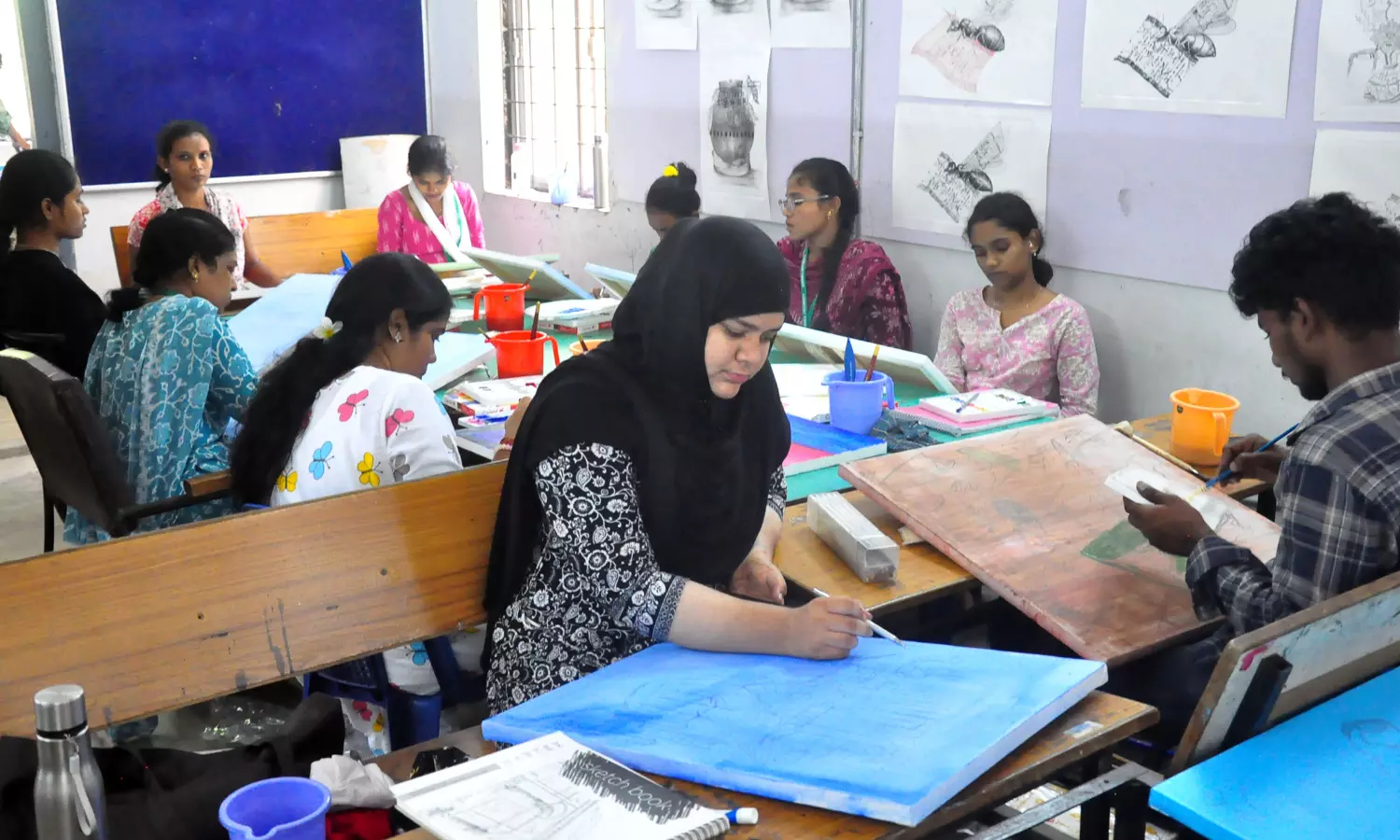 19Pnm01 to 04: Students busy painting during a painting competition organized by Vikasit Bharat ke Rang Kala Ke Sang at Andhra University Fine Arts Department in Visakhapatnam on Friday. (Photo: P Narasimha Murthy)