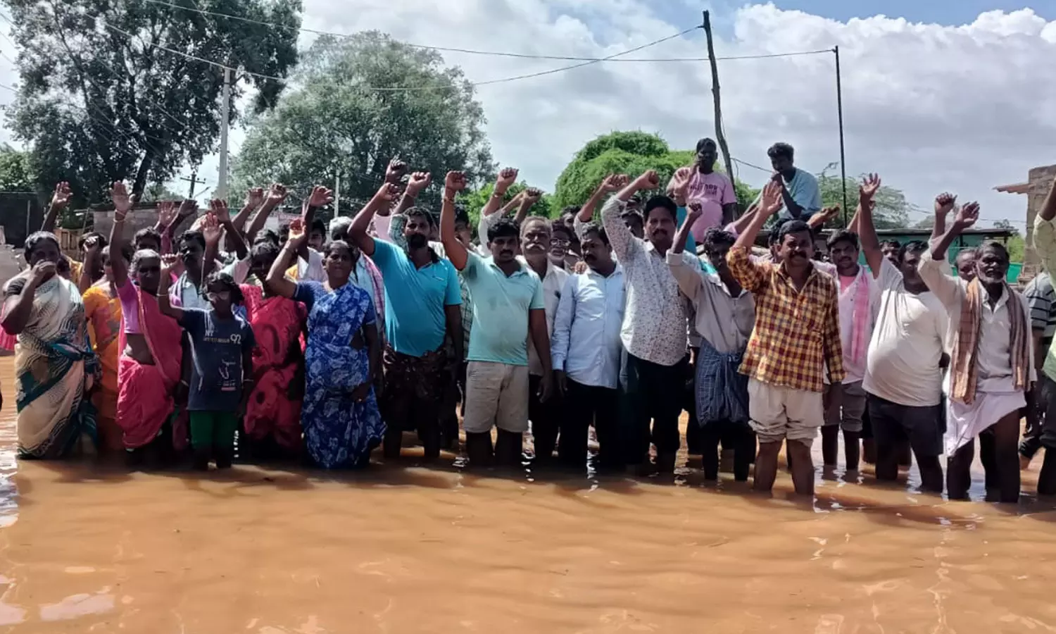 Visakhapatnam: Several Adivasi families on Thursday staged a novel protest, standing in knee-deep floodwaters in Ginnela Bazar area of Kunavaram in Chintur division of ASR district.