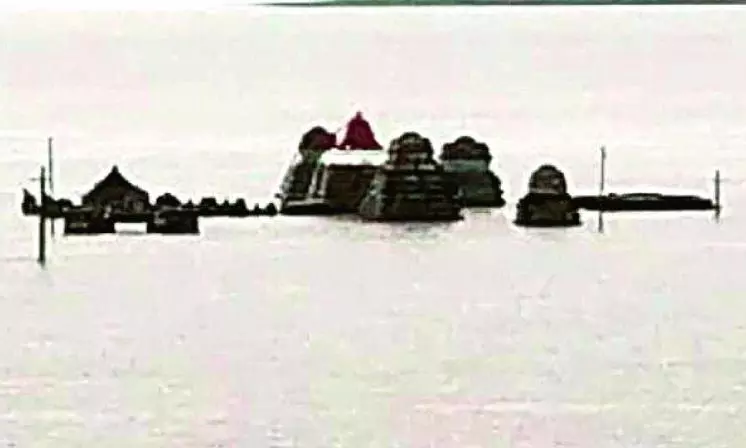 The rising backwaters of the Srisailam reservoir, brimming with monsoon bounty, have gently enveloped the Vepadaru Sivalingam within the temple.