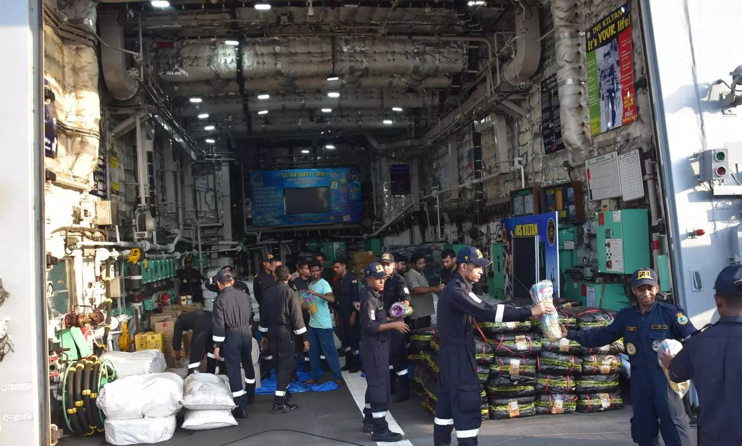 According to a release from the Eastern Naval Command, the Navy, in coordination with the Eastern Fleet and supporting units—including the Base Victualling Yard (BVY), Material Organisation, and INHS Kalyani—has completed the overnight loading of HADR pallets. These include relief gear, drinking water, rations, and medicines, onto a naval warship.