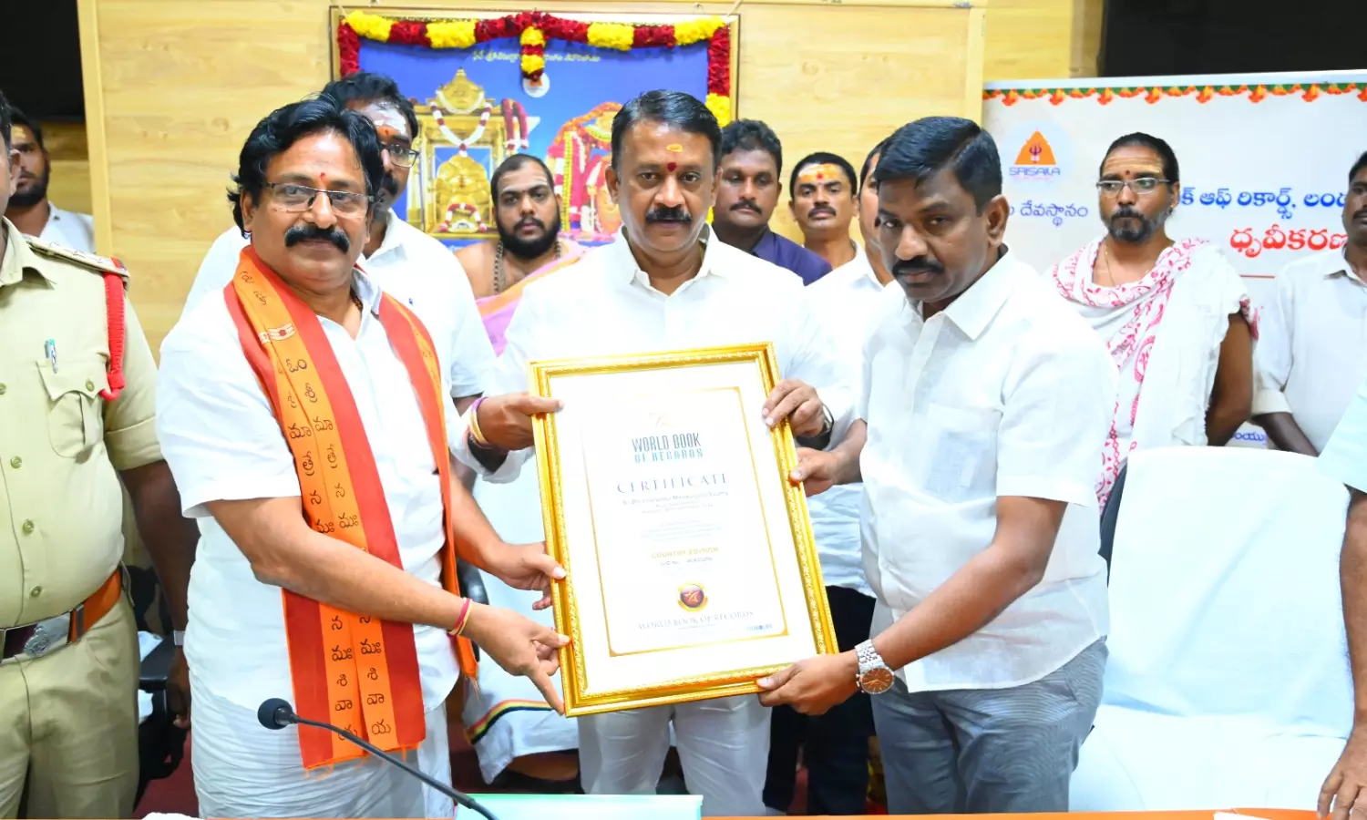 Representatives of the World Book of Records, Londan presented the certificate to the Srisailam Temple executive officer Peddi Raju at a programme at the temple on Friday.