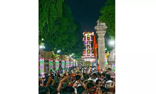 The event commenced with archakas reciting the Sankalpam, seeking the well-being of the world. After performing special poojas for the deities placed on the golden chariot, the procession began at 7:30 a.m. The chariot moved from Gangadhara Mandapam to Nandi Mandapam and returned, accompanied by devotional and cultural performances.