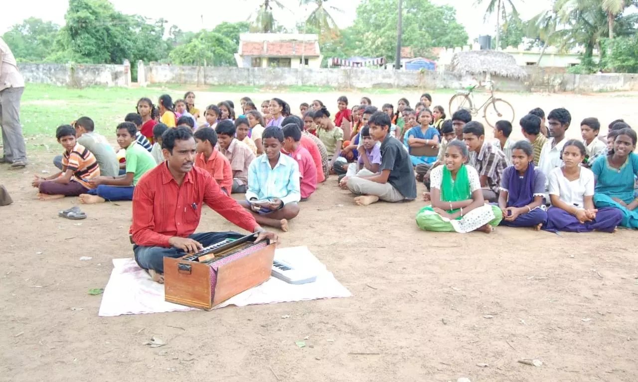 Social Studies teacher Bonthalakoti Shankara Rao, currently at the GT Peta school, has been on the job since 1998 and exchanged traditional chalkboards for musical instruments. Utilising harmonium, keyboard, guitar, kanjira and tappeta gullu, he transforms conventional lessons into musical experiences.