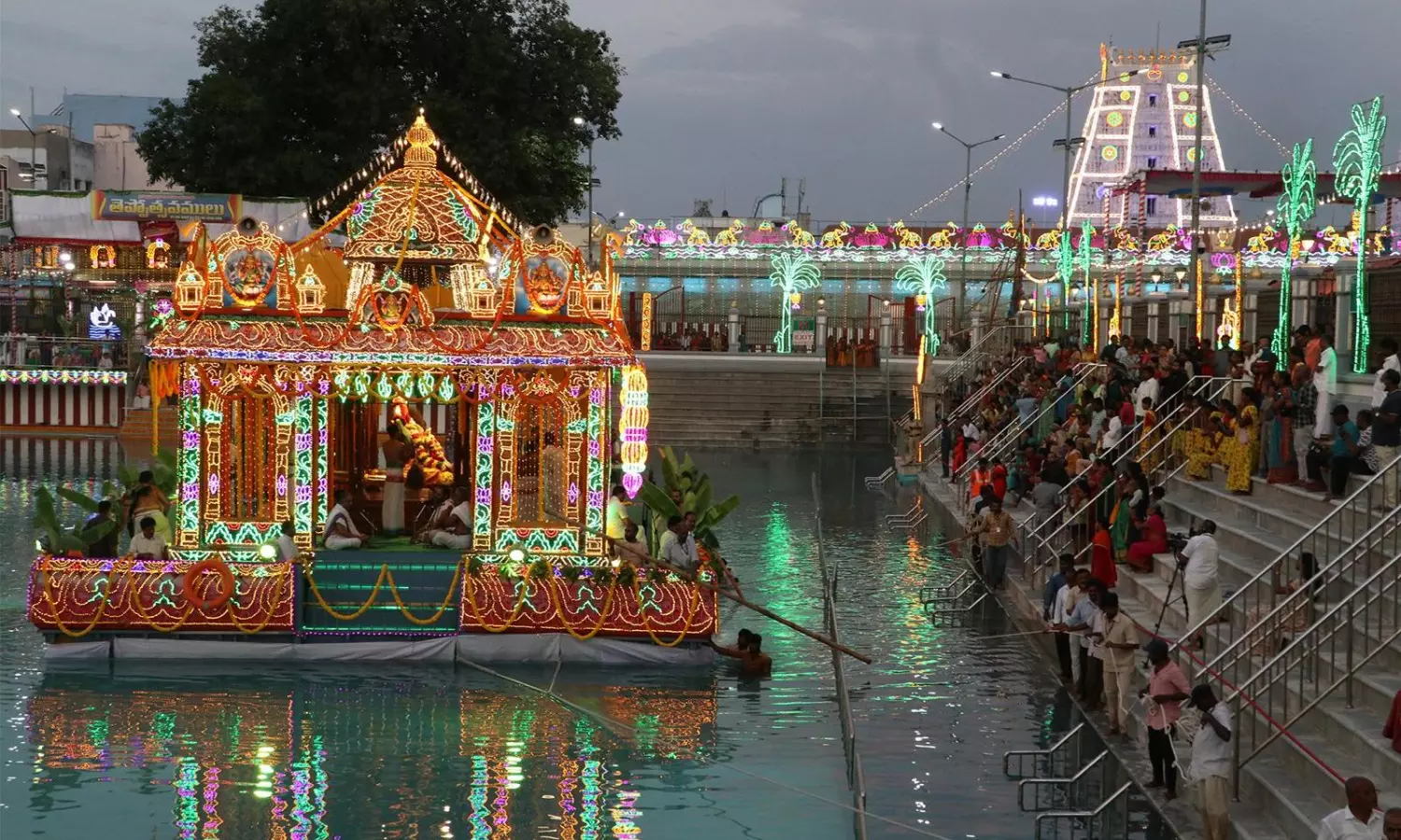 On the first day, the idols of Sri Krishnaswamy along with consorts Sri Rukmini and Sri Satyabhama were taken on a beautifully adorned float for three ceremonial rounds in the sacred Padma Sarovaram. Devotees gathered in large numbers to witness the divine spectacle.