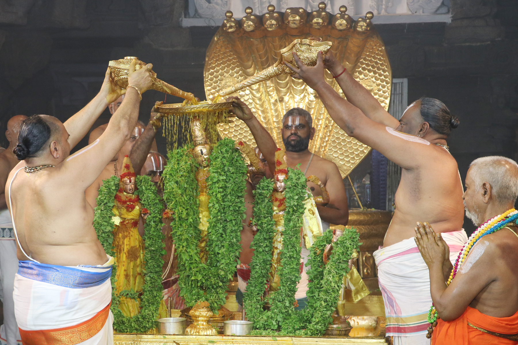 Vedic scholars chanted hymns from the Taittiriya Upanishad, Purusha Suktam, Sri Suktam, Bhu Suktam, Neela Suktam, Pancha Shanti mantras, and verses from the Divya Prabandham during the ritual. The event was attended by Tirumala Pedda Jeeyar Swamy, TTD executive officer Syamala Rao, additional EO Venkaiah Chowdary and others.