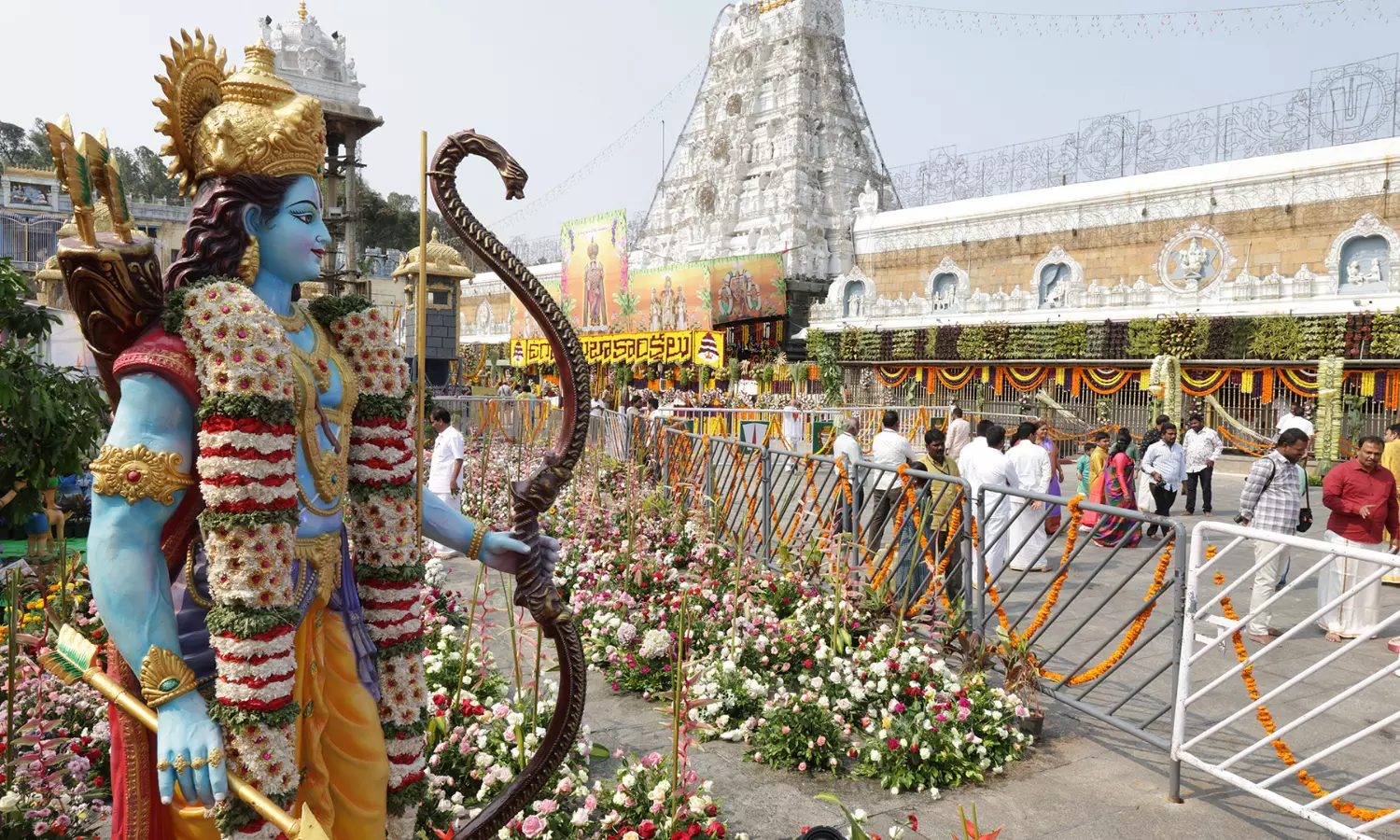 The TTD adorned the temple premises with floral decorations featuring unique mythological themes. The Garden Department used around eight tonnes of ornamental and traditional flowers to create displays near Golla Mandapam, depicting Radha Krishna, Balarama Krishna, and Maha Vishnu with Garuda and Hanuman.