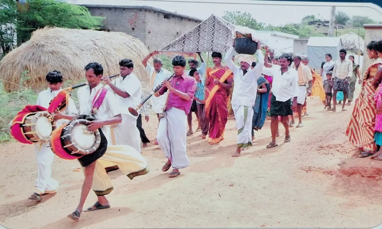 On the designated day of the pre-wedding ritual, the groom, transformed into a bride, holds a trident in one hand and sandalwood paste in the other. The bride, dressed as a groom, carries a bonam or offering on her head. In their transformed roles, the couple, accompanied by family members, relatives and villagers, lead a procession to the sacred Veerula Jammi Chettu, a significant religious site for the community.