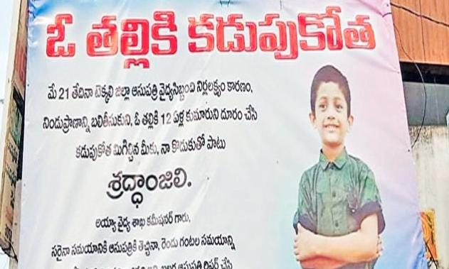 Visakhapatnam: Mourning parents of a 12 year Sai Vineet boy who died of a snake bite recently, put up a flexi on the road to hospital in Tekkali in Srikakulam district seeking action against the doctors who they alleged did know the basic difference between a thorn injury and a snake bite that led to the death of their boy.