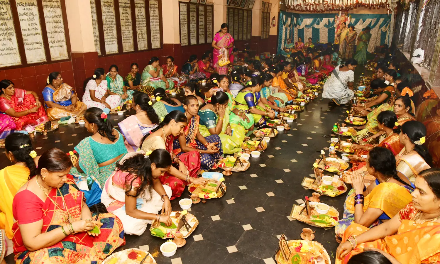 Kanika Parmeswari was adorned in a stunning pearl saree. The decorations were unveiled at 5 am, after which 108 items, including pure water, milk, curd, honey, sandalwood, turmeric, saffron, and various fruit juices, were offered to the main deity in the temple. Special pujas were performed for the goddess.