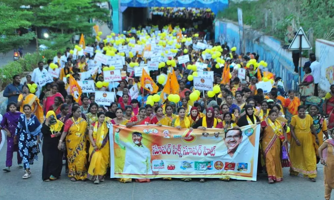 The rally, which began at Gandhi Bomma Centre and concluded at Pappula Veedhi, saw women carrying placards highlighting the six flagship schemes—enhanced pensions, Talli Ki Vandhanam cash transfers to mothers, increased Annadata Sukhibhava support for farmers, free annual distribution of three LPG cylinders per household, Stree Shakti free bus travel for women, and large-scale teacher recruitment through the Mega DSC.