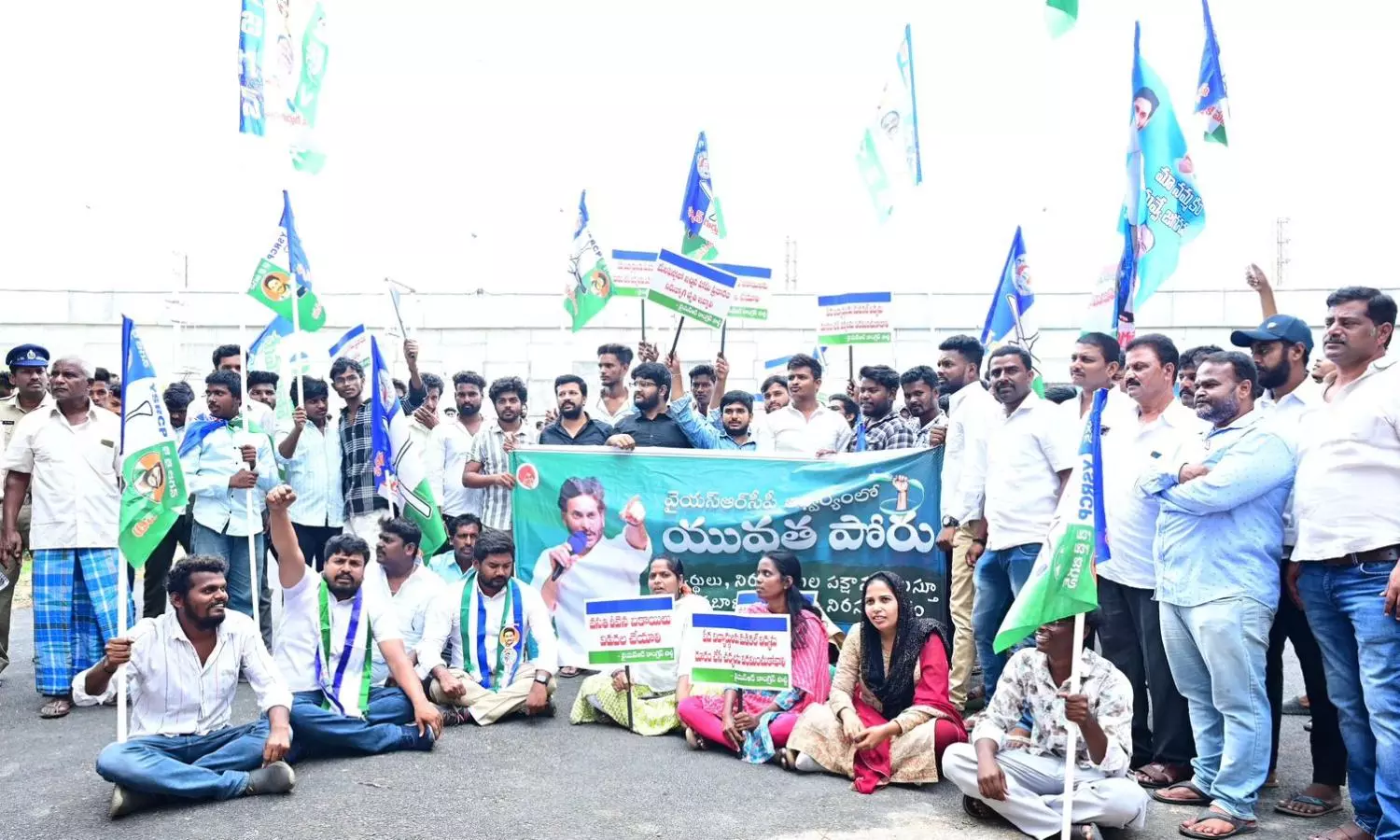 From Nellore Old ZP office to the collectorate, the youth marched in a rickshaw-driven protest unique to the cause. With placards in hand, they voiced strong opposition to perceived injustices by the government, highlighting issues like unpaid unemployment allowances and delayed fee reimbursements.
