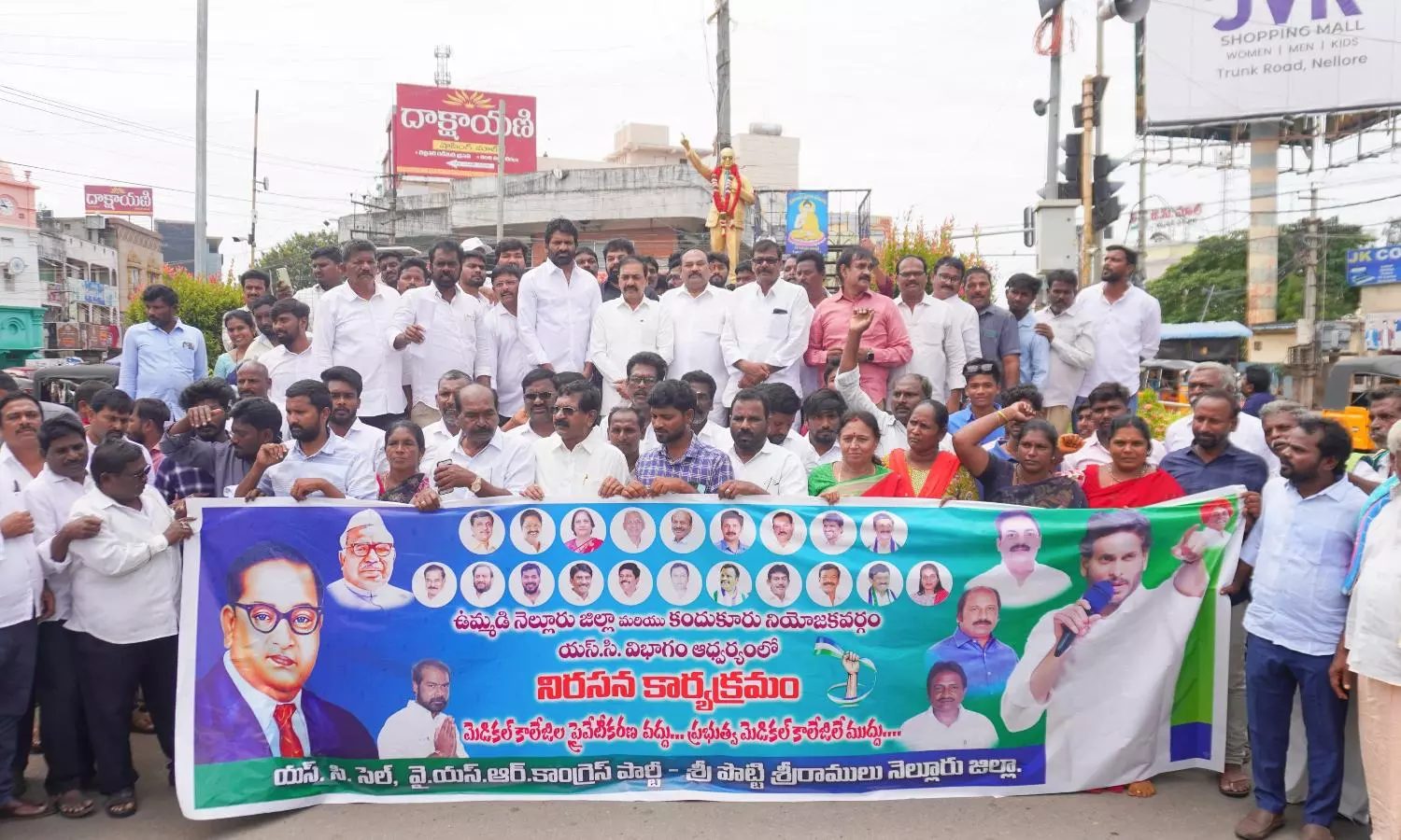 Vijayawada:The YSRC SC Cell has launched statewide protests opposing the privatisation of government medical colleges in Andhra Pradesh. Party leaders and activists staged demonstrations across all district headquarters, raising slogans against the state government and demanding immediate withdrawal of its decision.