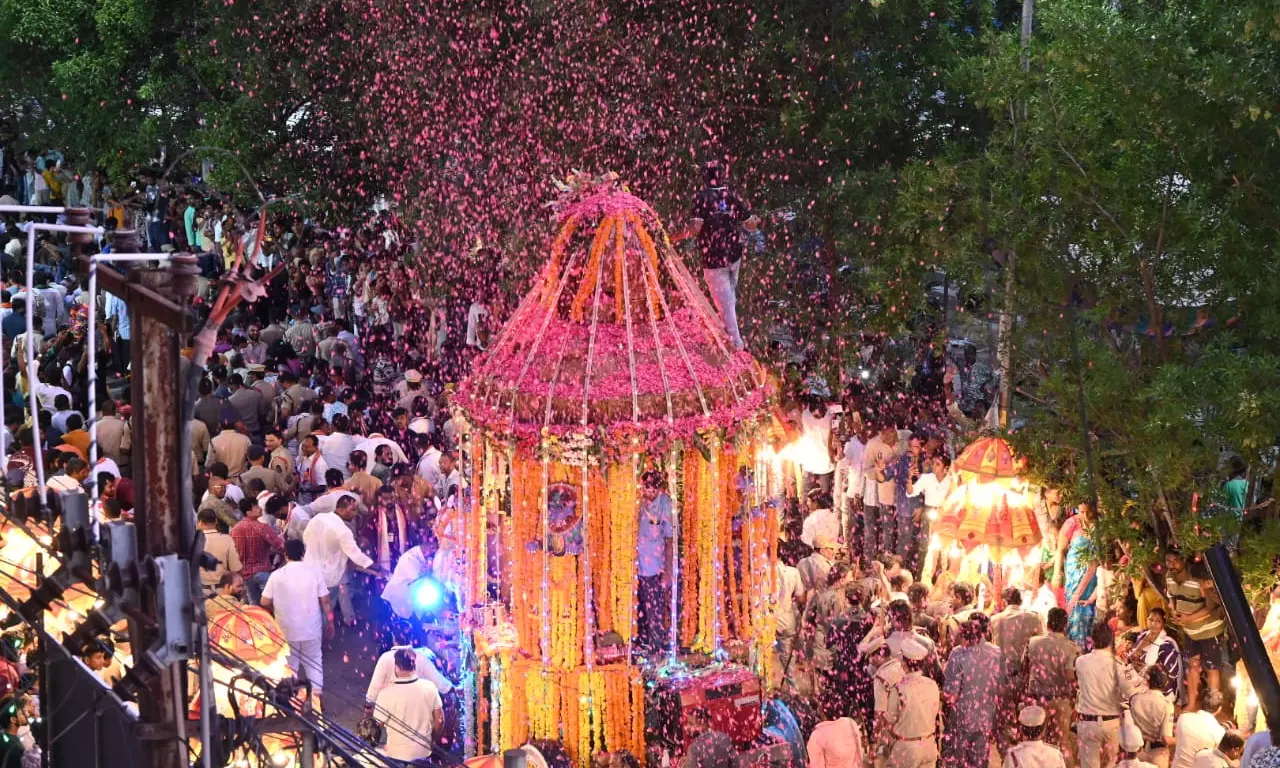 Hyderabad: The grand procession of Ratha Yatra held on Wednesday concluded the three-day of Renukadevi Ammavaru Kalyanamahotsavam. The procession saw a number of brass bands, DJs, traditional dancers, convoy of mascots, idols, singing praises of the deity. The police deployed its personnel along the the temple roads to avoid any untoward incident after incident of transport minister Ponam prabhaker being pushed at the entrance of the temple on Tuesday.