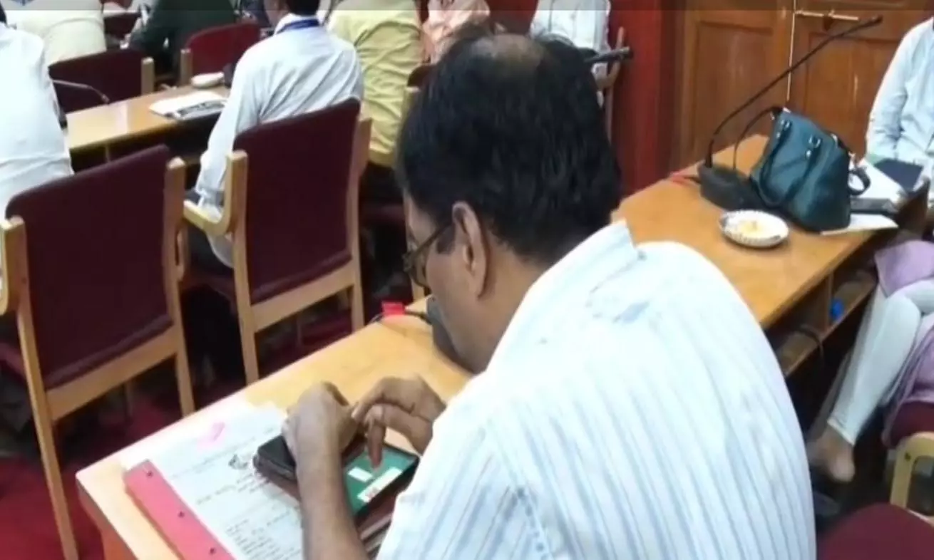 The incident came to light after a private news channel aired footage showing the officer, identified as Praveen, engrossed in the mobile game while the review meeting was in progress: Reports