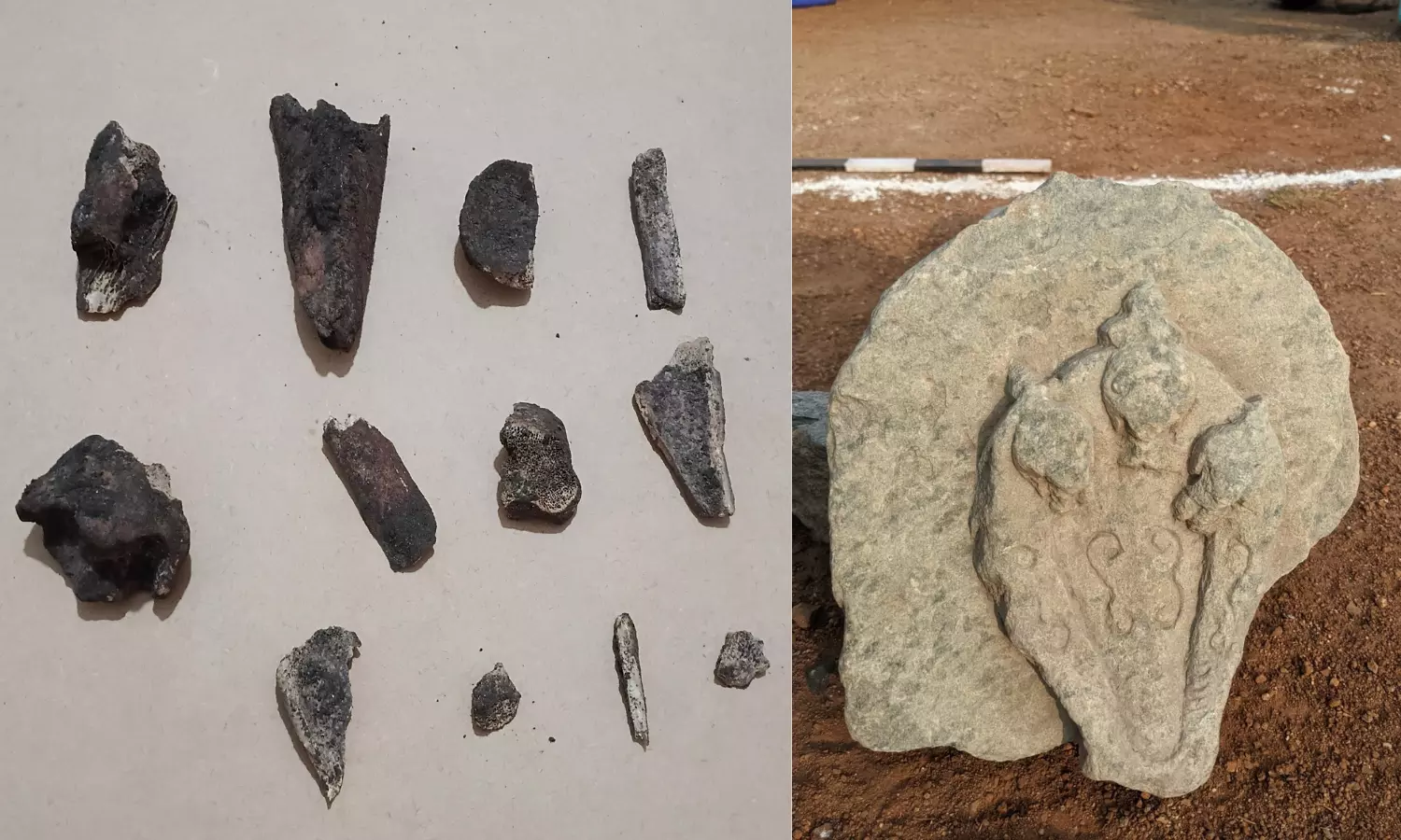The finds included an ornamented broken Naga sculpture with what appeared to be three crowns, bone fragments, a circular terracotta object and a damaged fragment likely to be part of a dome or kalasha.