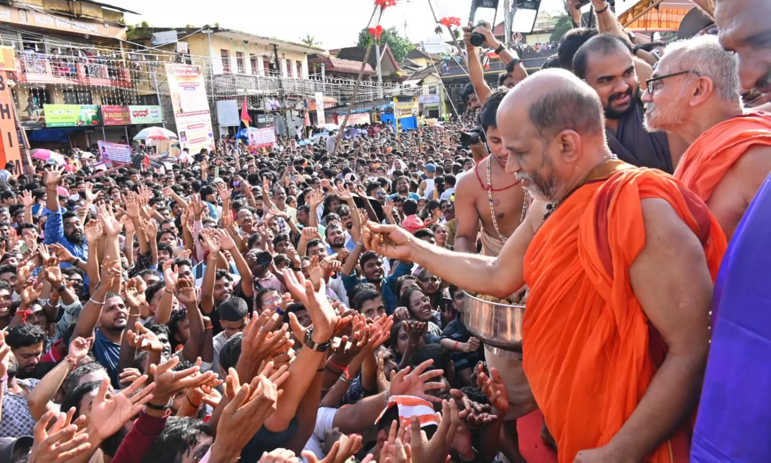 The highlight of the evening was the clay idol of Lord Krishna, which was carried in a grand procession on a golden palanquin from the Math to the Golden Chariot. In Ratha Beedi, the traditional Mosarukudike ceremony took place, and seers distributed laddus and chakkuli as prasadam to the gathered devotees.