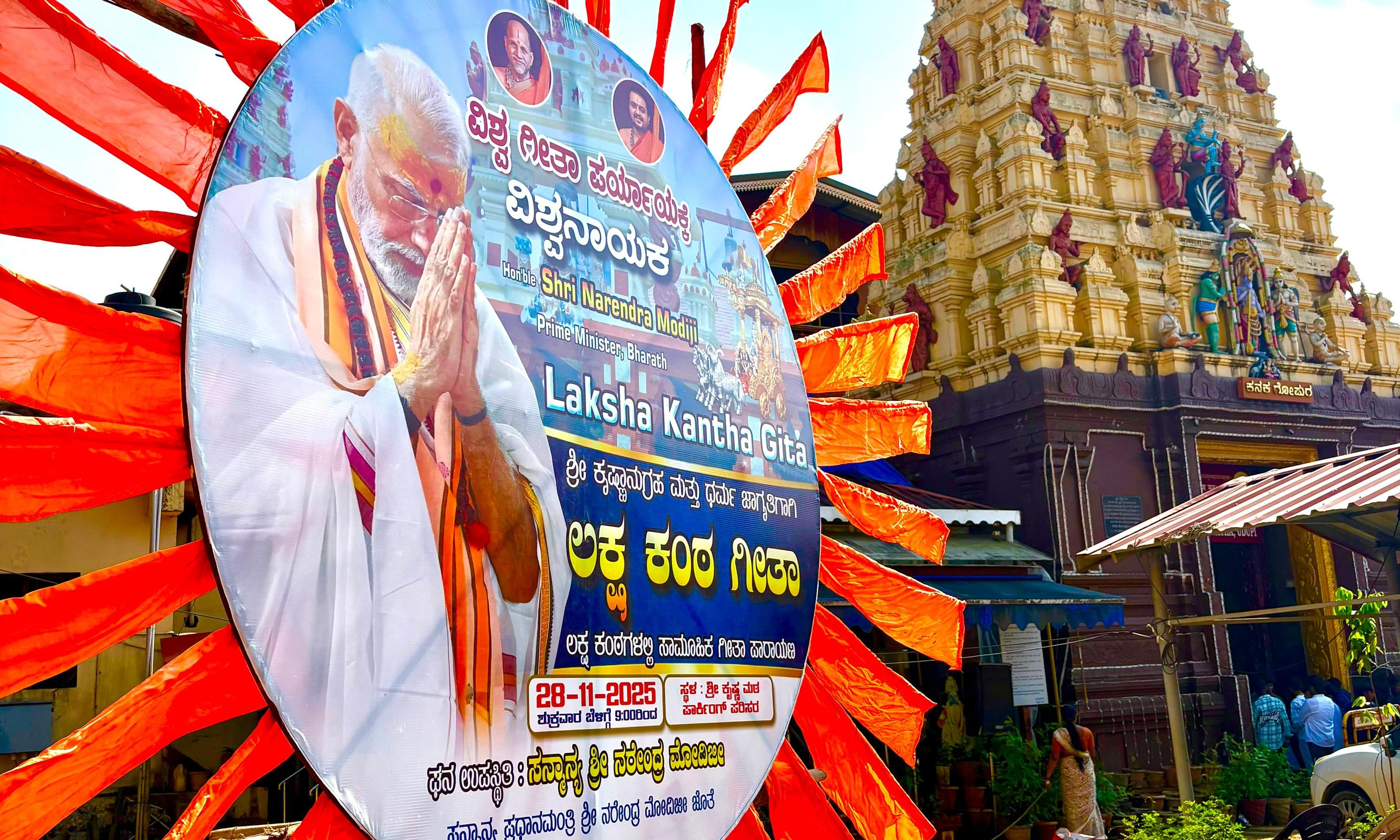 The Laksha Kantha Gita Parayana, envisioned by Paryaya Puthige Math, is the highlight of a month-long Gitotsava that has transformed Udupi into a living classroom of the Gita. “This year we are hosting a much larger programme,” said Sri Sugunendra Tirtha Swamiji of Puthige Math. “From 10 a.m. to 12.30 p.m. on November 28, one lakh devotees will recite shlokas from the Bhagavad Gita and offer them to Lord Krishna. The Prime Minister will also recite a few shlokas.”