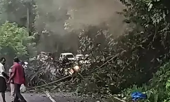 Kochi: A female engineering student was killed and a youth sustained injuries when a huge palm tree branch fell on their motorcycle near Kothamangalam on Saturday. Ann Mary C V (21), a native of Thrissur, was riding pillion on the bike driven by her college mate Altaf Aboobacker (21) around 6 pm at Chembankuzhy near the Nagarampara forest office, and the branch of the tree uprooted by the elephant, fell on them, police said.