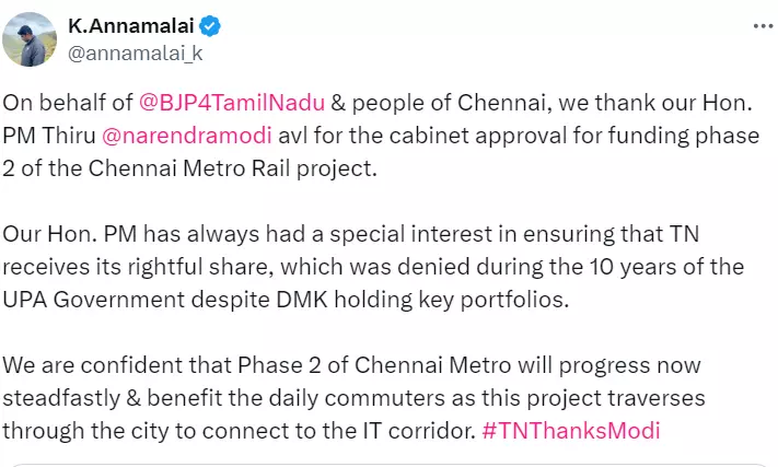 Annamalai, who said that Modi had a special interest in ensuring that the State received its rightful share, which was denied during the 10 years of UPA rule, had earlier, on September 30, written to the Prime Minister saying the Rs 63,246 crore project had hit a roadblock and uploaded the letter in his X page to create an impression that the Union Cabinet approved of the project at his behest.