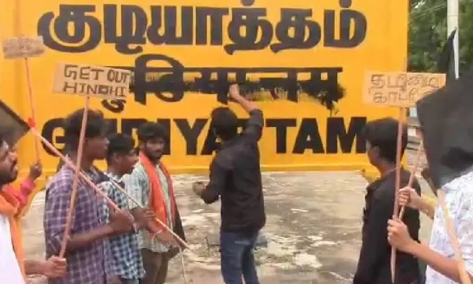 Pollachi: Amid the language row in Tamil Nadu where the ruling DMK has been alleging Hindi imposition by the Centre, pro-Tamil activists blackened the Hindi words painted in the nameboard at the railway station here on Sunday. In a viral video, the activists were seen painting black paint on "Pollachi Junction" written in Hindi, but officials later rectified it.