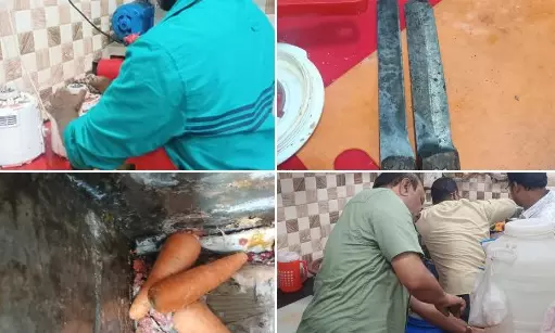 Food safety officials reported that the Food Business Operator (FBO) was running the establishment without a valid Food Safety and Standards Authority of India (FSSAI) license or registration. The inspection revealed hygiene lapses, including the absence of a proper drainage system in the preparation area, a highly rusty and unhygienic refrigerator, and rusty iron knives used for food preparation. Additionally, the shop failed to provide water analysis reports, pest control records, or medical fitness certificates for food handlers. Open dustbins were also found on the premises.