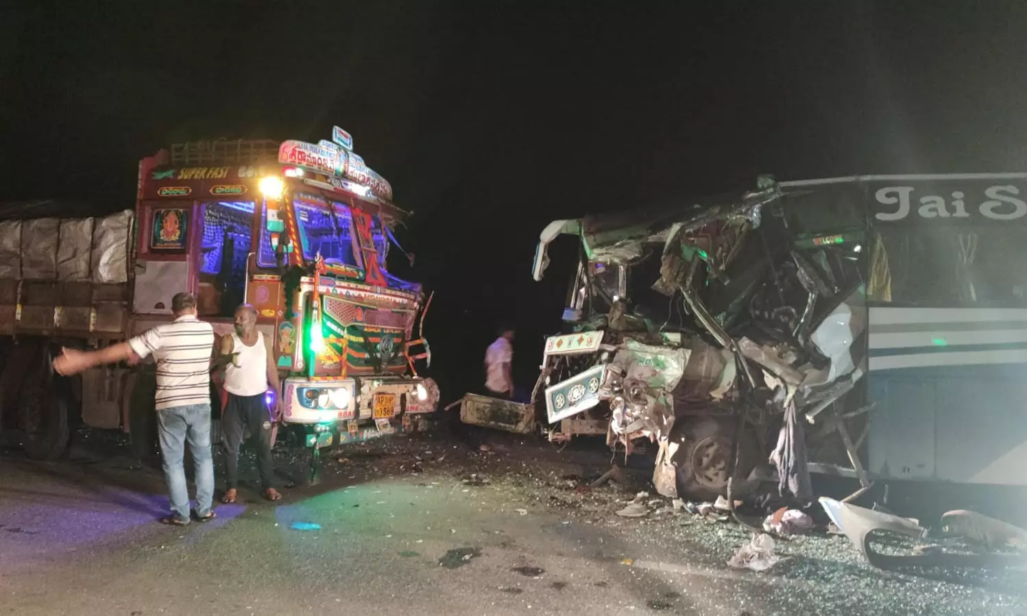 Suryapet: A private bus and a lorry collided at Keethavarigudem in Garidepally mandal, resulting in injuries to at least 15 passengers, in the early hours of Thursday.