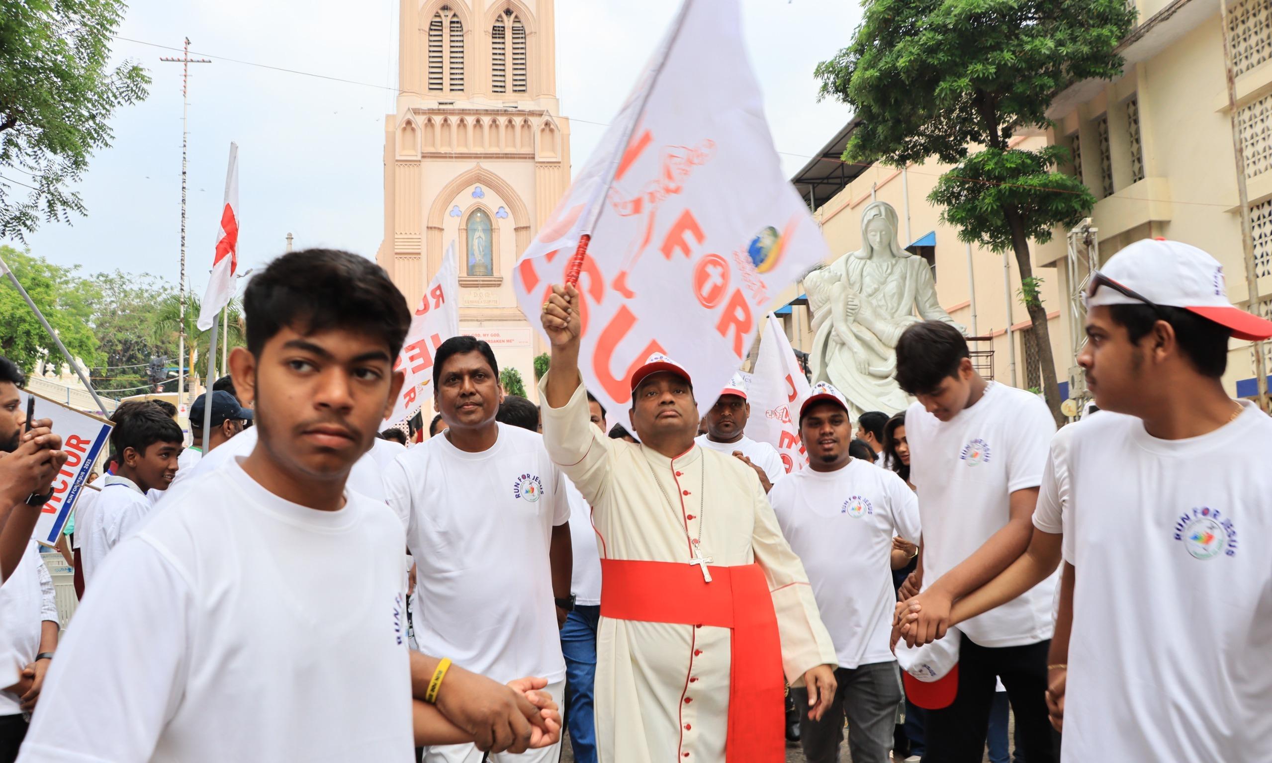 The largest gathering assembled at St Mary’s Basilica, Secunderabad, where Cardinal Poola Anthony flagged off the march to St George’s Grammar School in Abids. Participants proceeded on foot, motorcycles and cars — singing hymns and waving flags. The event was held in the pre-dawn hours to avoid traffic disruption.