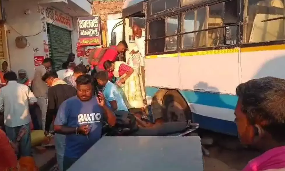 Warangal: A speeding lorry crashed into an RTC bus and then rammed into a nearby pan shop at Palakurthy in Jangaon district on Sunday. The bus, travelling from Thorrur to Hyderabad with 11 passengers, was struck by a lorry heading from Nalgonda to Hanamkonda when the vehicle lost control.
