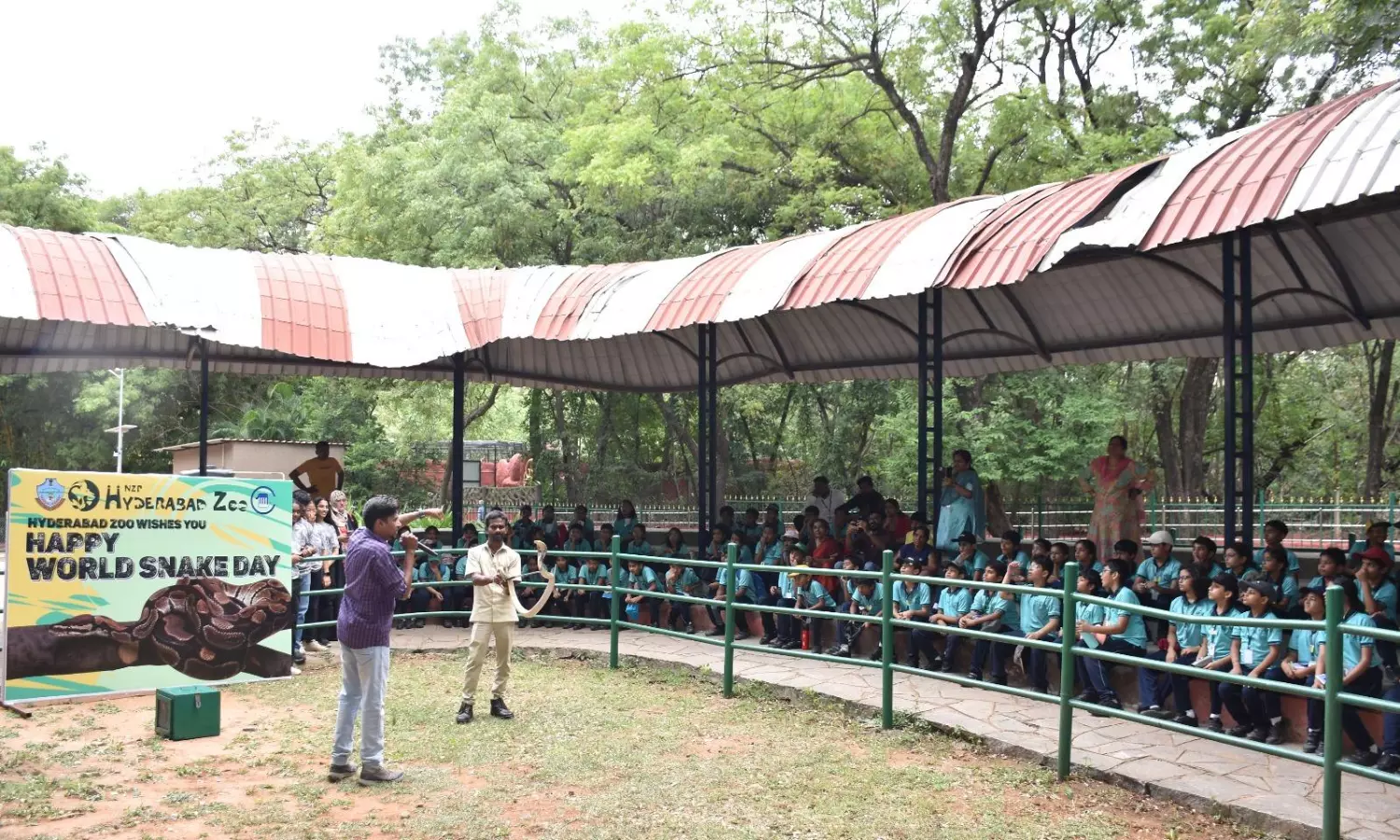 Hyderabad: World Snake Day was celebrated on Tuesday at Nehru Zoological Park in Hyderabad. An awareness programme was also organised at the Reptile House Amphitheatre on the zoo campus. Around 700 school students and 600 visitors took part in the event, which aimed at educating people about snakes and its role in the ecosystem.