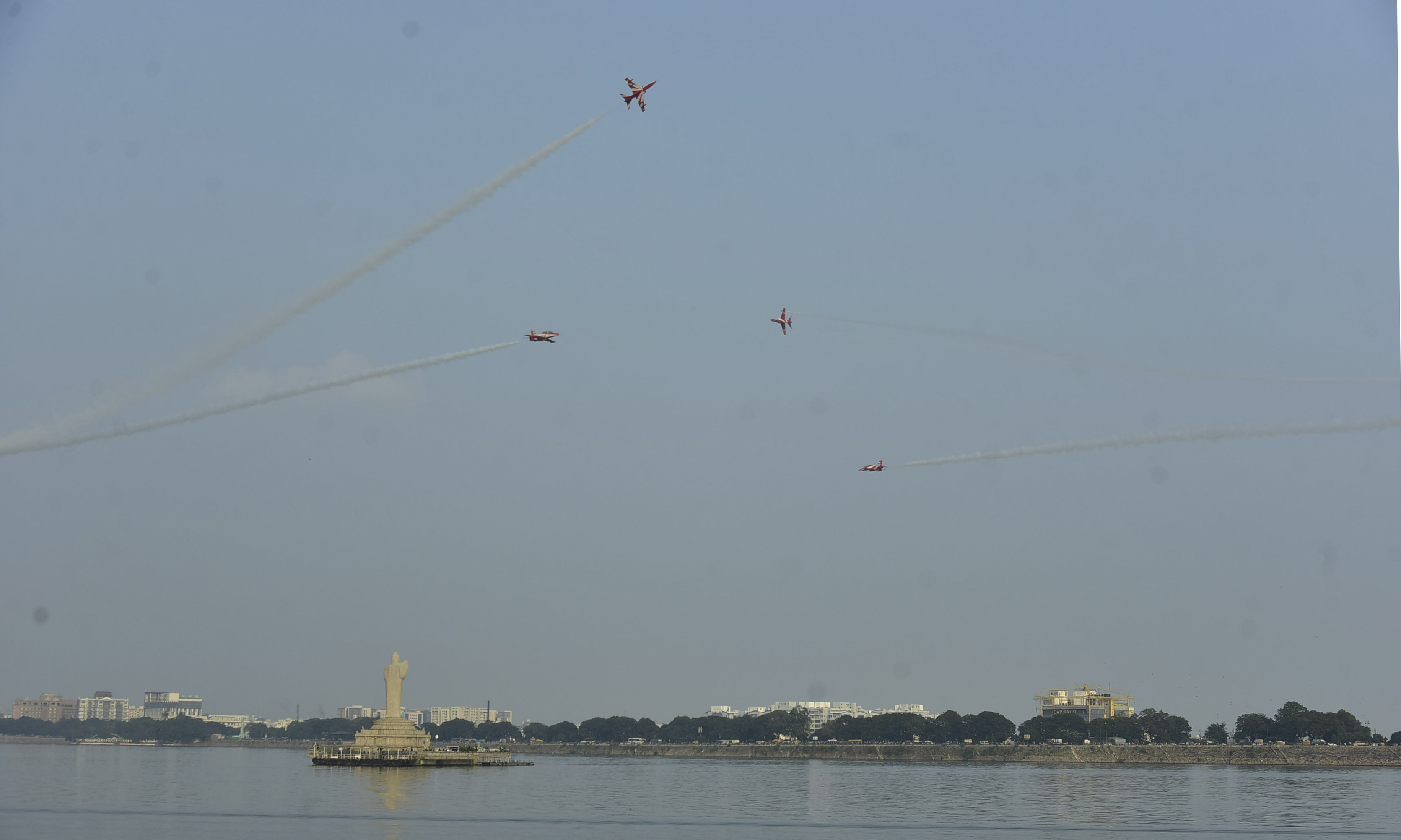 Commuters at Tank Bund were seen stopping to watch the air show. K. Vishwak, who brought his children to the event, said he wanted them to learn about the Indian Air Force.