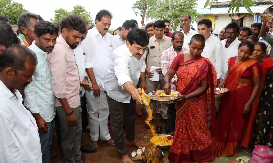 Along with district collector Anudeep Durishetty, the minister laid the foundation stone for a CC road and participated in the bhoomi puja of a beneficiary's house in the SC Colony of Guvvalagudem in Nelakondapally mandal of Khammam district.