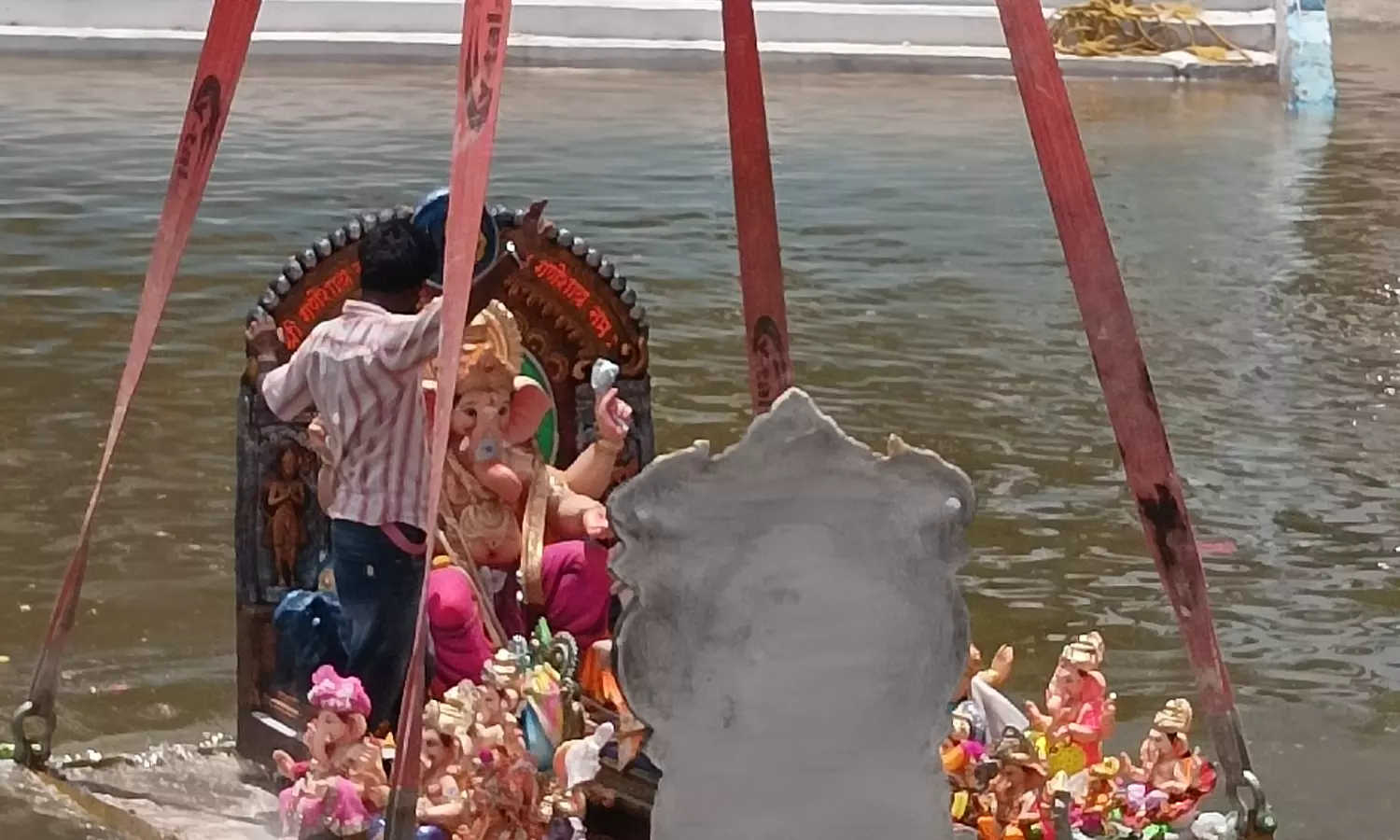 Most of the crew, he added, came from the same family and were hired by contractors. The tips, he admitted with a grin, made the hard work bearable. “Some give ten or twenty, sometimes even five hundred. My job is to fix the idols on the crane and let them down into the pond.” Officials at the artificial pond counted more than a hundred immersions there by noon on Saturday, including twenty idols between six and seven feet tall; there was hardly any queue or traffic.