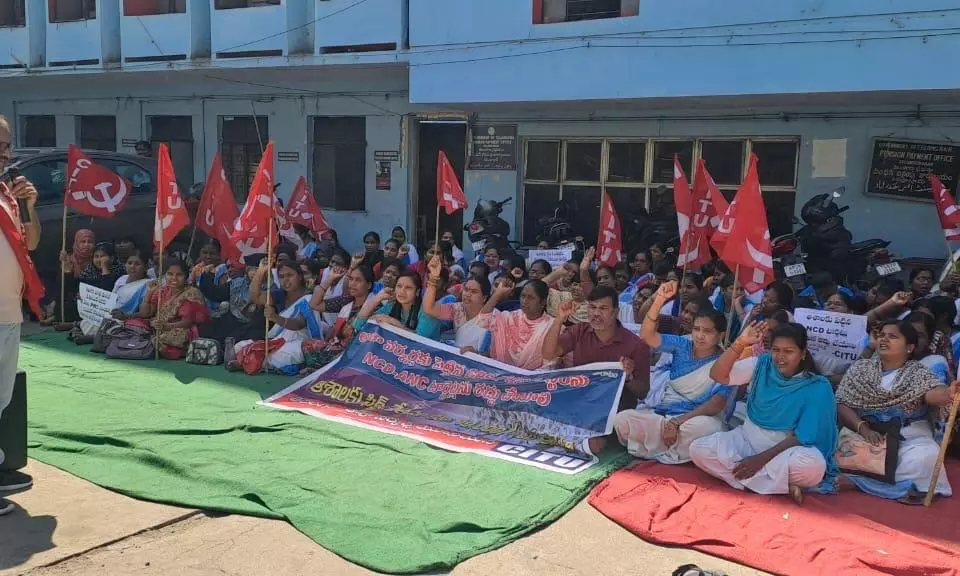 Hyderabad: ASHA workers protested outside the district medical and health officer here on Thursday demanding the removal of the GPS tracking system, relief from excessive workload and implementation of fair wages. Under the banner of Telangana ASHA Workers Union (CITU), they submitted a representation outlining their long-standing grievances.