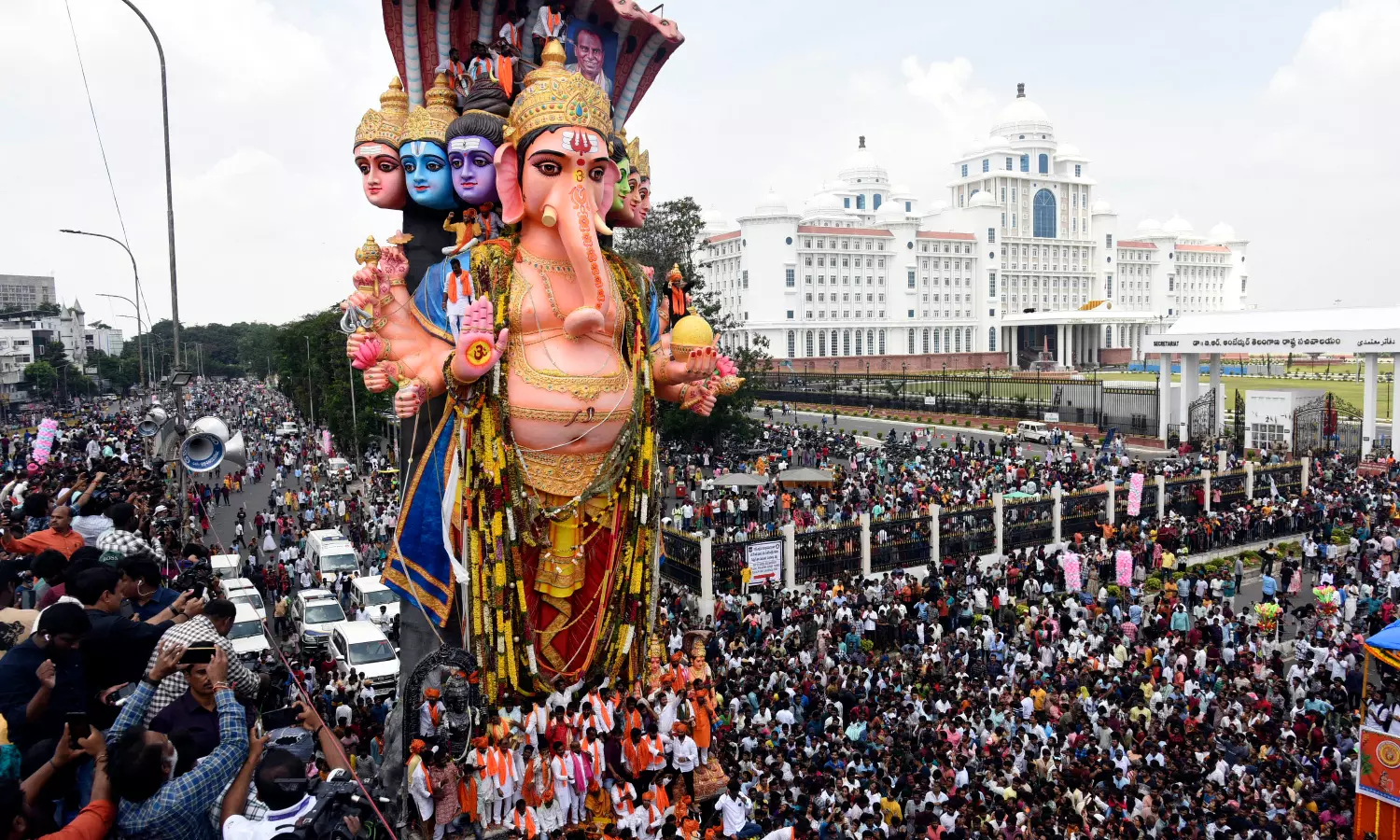 At 5 am, the Bada Ganesh idol was lifted, placed and welded on the transporting truck, and at 6.30 am, the grand procession began to Hussainsagar.
