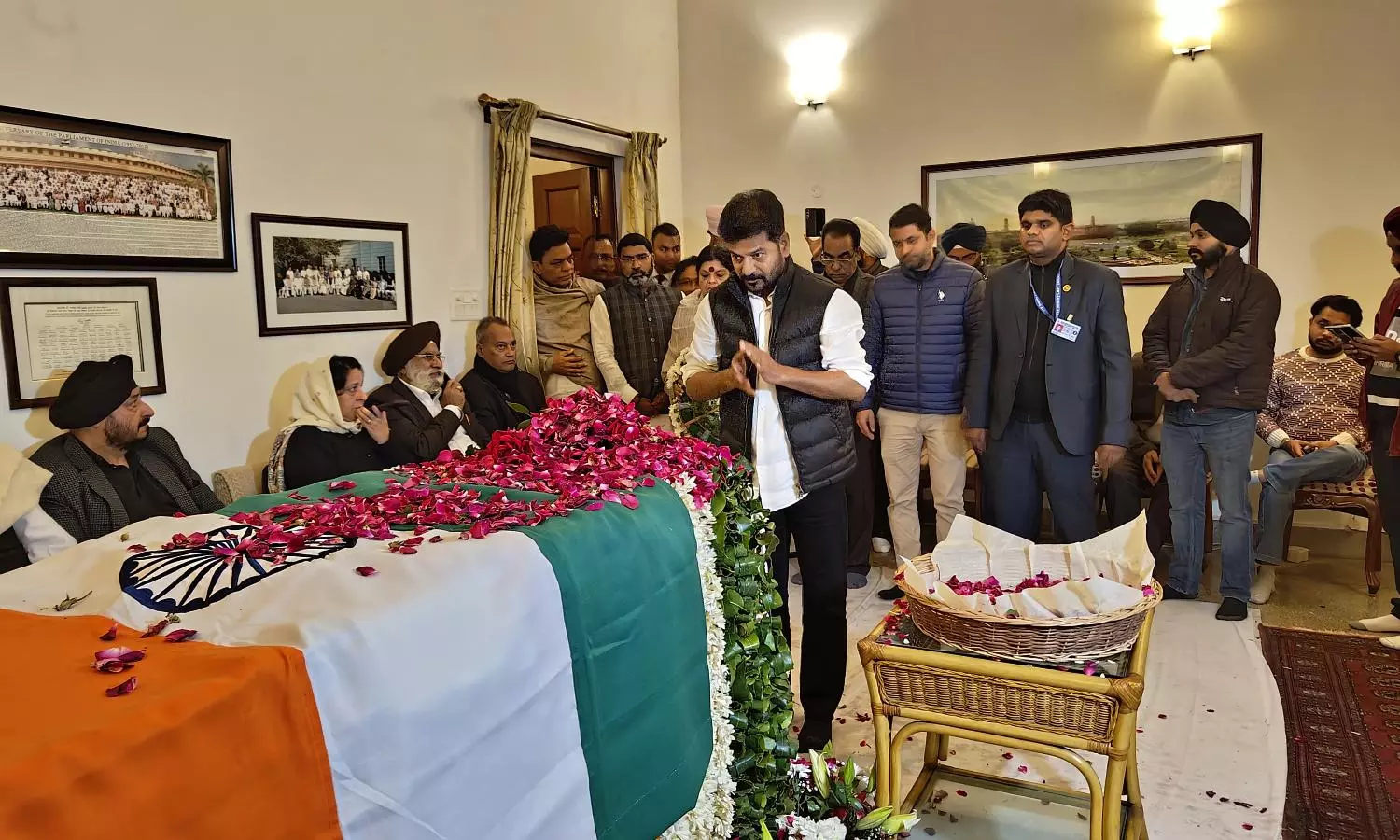 Revanth Reddy, along with a delegation of Congress leaders, flew to New Delhi from Belagavi in Karnataka to honour Dr Singh.