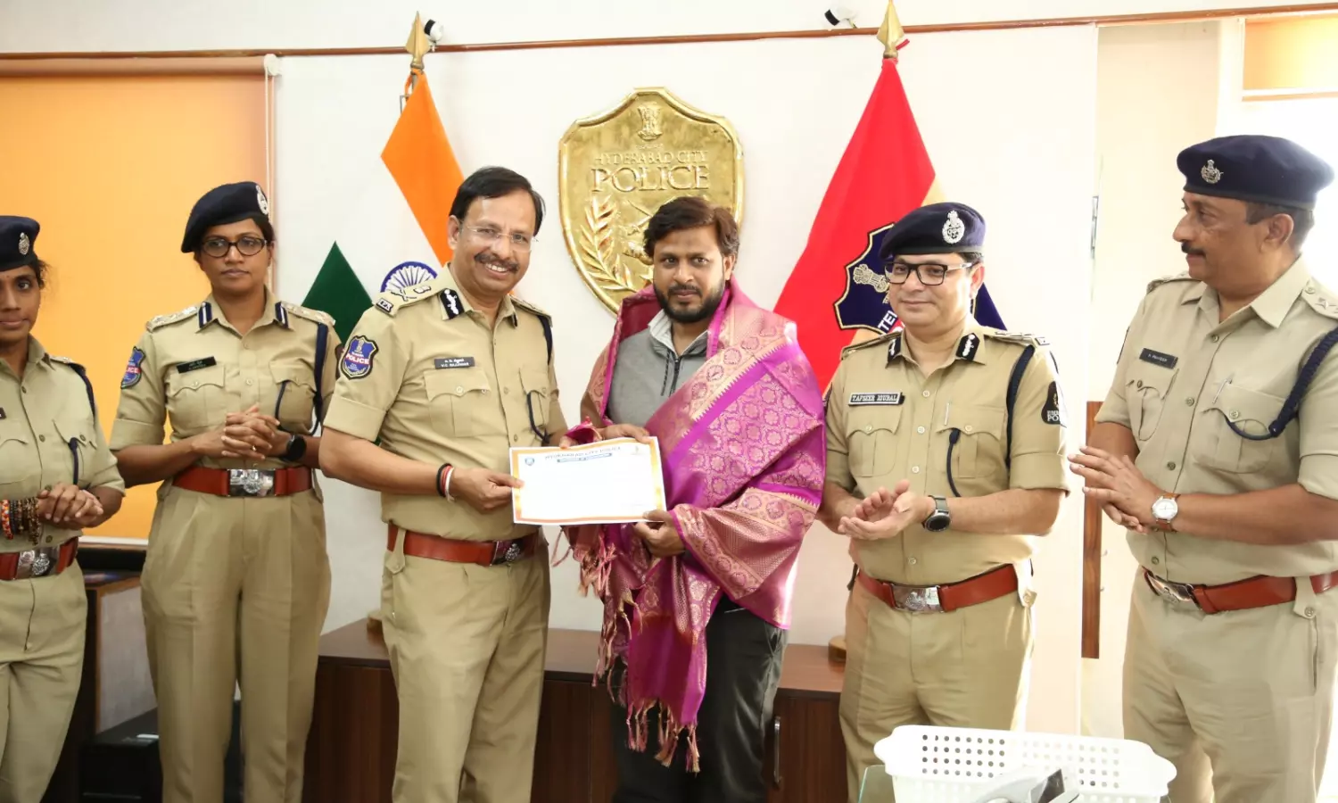 HYDERABAD: City police commissioner V.C. Sajjanar felicitated Mohammed Feroz, who rescued an eight‑year‑old girl in distress through his timely intervention and presence of mind, at the old commissioner’s office in Basheerbagh on Monday. Sajjanar, along with senior officials, honoured Feroz with a shawl and presented him with a certificate of appreciation and a cash reward.