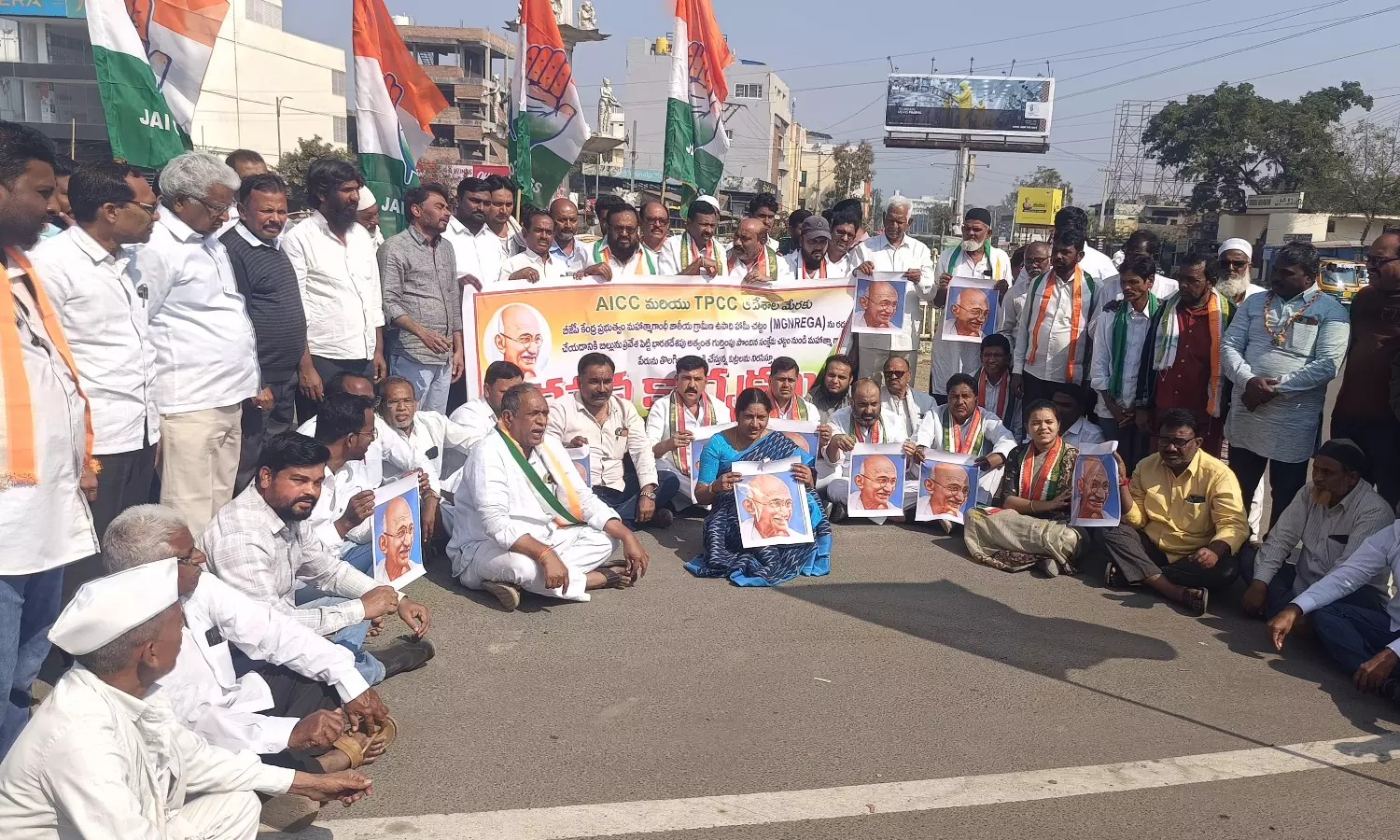 Adilabad: Congress leaders and cadre on Wednesday staged a sit-in protest in Adilabad town against the BJP-led Central government’s move to remove the name ‘Gandhi’ from the Mahatma Gandhi National Rural Employment Guarantee Scheme (MGNREGS).