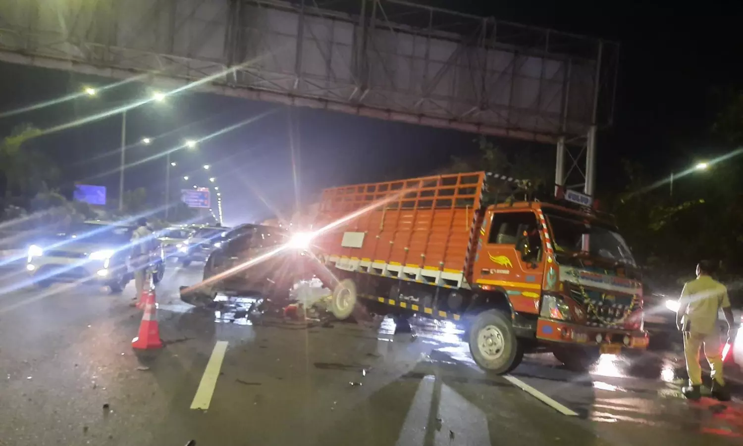 According to the Cyberabad Traffic Police, "At around 8:45 PM on ORR, near Greyhounds, a DCM vehicle while proceeding from TGPA towards Gachibowli, suddenly lost its left rear wheels, forcing the driver to halt on the carriageway. Meanwhile, a Fortuner coming from behind collided with the stationary DCM, leading to an accident."