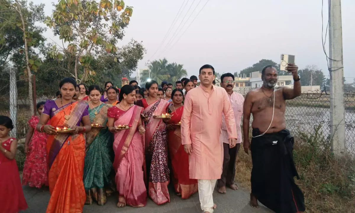 Noted film producer Dil Raju, along with his family members, participated in the service. The temple’s chief trustee Narasimha Reddy, Vijaya Simha Reddy and family members, villagers of Narsingpally, and service volunteers including Narala Sudhakar also took part. Renowned musician Ramachary participated in the celebrations.