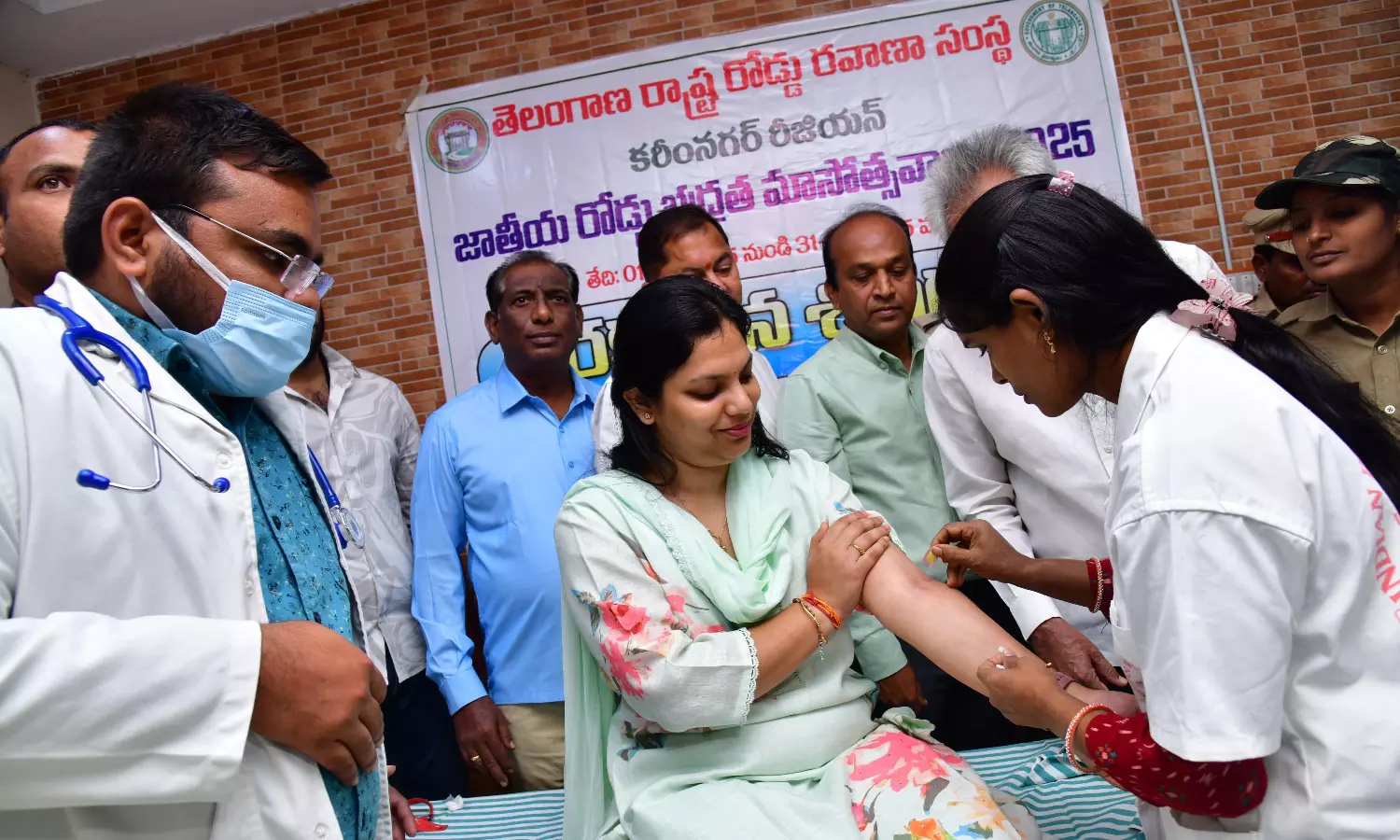 Karimnagar: Karimnagar district collector Pamela Satpathy urged people to become lifesavers by donating blood. She inaugurated a blood donation camp organised by the Telangana State Road Transport Corporation (TGSRTC) in collaboration with the Indian Red Cross Society Blood Centre as part of National Road Safety Month celebrations at the Karimnagar Bus Station on Wednesday.