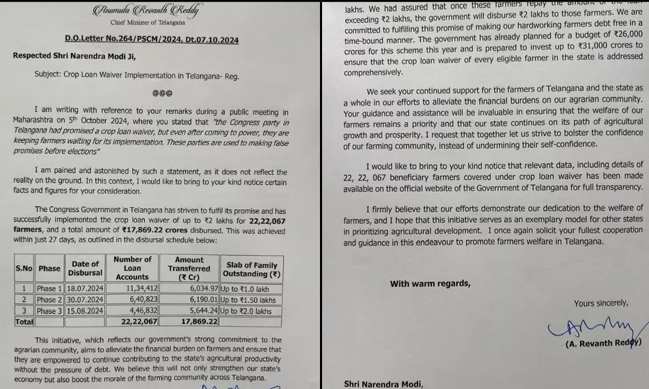 Hyderabad: In response to the allegations by Prime Minister Narendra Modi that the Congress government in Telangana has not been implementing loan waiver to the farmers in the state, Chief Minister A. Revanth eddy has written a letter to him sharing all facts and figures about the successful implementation of the scheme in the first year of the Congress rule in the state.