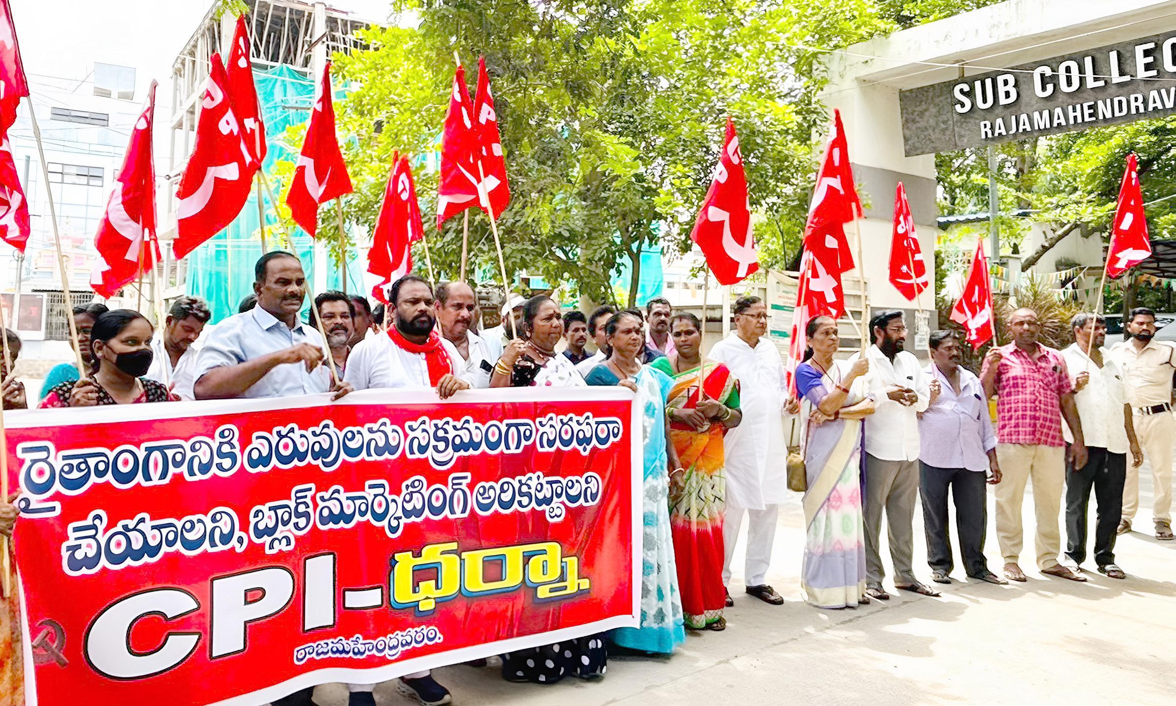 Hyderabad: Farmers and landowners whose properties are set to be acquired for the Regional Ring Road (RRR) staged a protest in front of the Hyderabad Metropolitan Development Authority (HMDA) office at Swarna Jayanthi Complex, Ameerpet, on Monday, demanding a change in the proposed alignment.