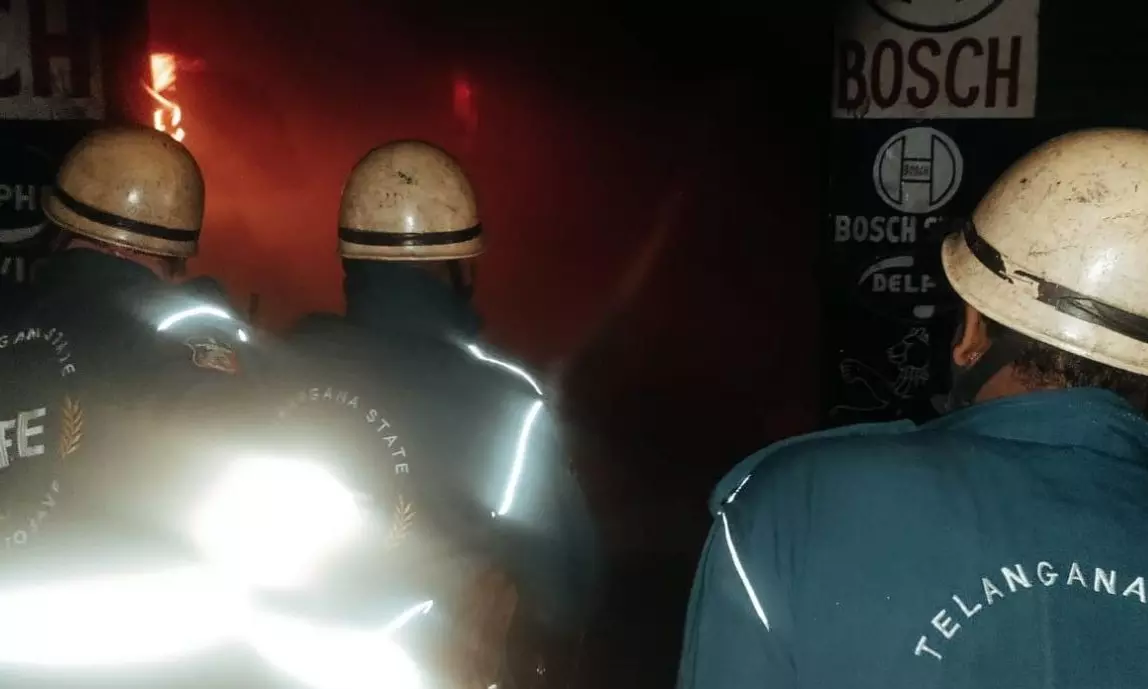 Hyderabad:Fire broke out at an automobile workshop in a residential area located close to Gandhi Bhavan late on Wednesday night. Panic gripped the residents of Patel Nagar due to the dark flames emitting from the fire that hit the workshop.