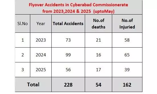 Hyderabad: Hyderabad’s 84 flyovers, built to ease congestion, have witnessed 656 accidents in the last three years. According to data provided by Hyderabad, Cyberabad and Rachakonda commissionerates, 656 accidents happened on the flyovers between January 2023 and May 2025 and resulted in 126 deaths and 504 injuries, highlighting the safety gaps, especially the absence of CCTV coverage on the flyovers.