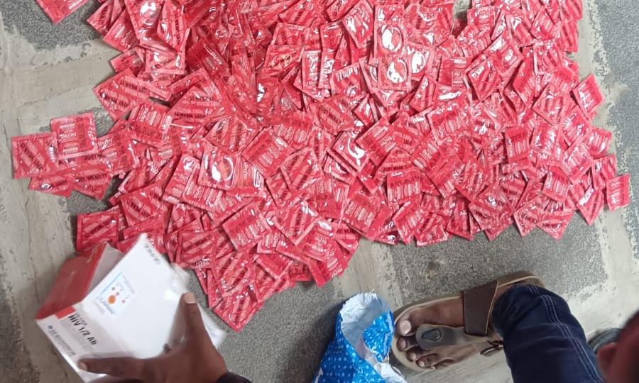 Officers seized five mobile phones, ₹2,750 in cash, 1,000 condom packets, a motorcycle and 29 HIV diagnostic kits.