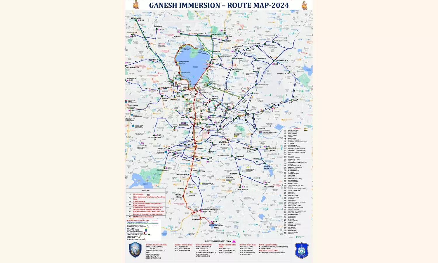 The processions from Tolichowki, Rethibowli and Mehdipatnam are take the Masab Tank, Ayodhya Junction,– Nirankari Bhavan, Dwarka Hotel, Iqbal Minar route to reach NTR Marg and PVNR Marg (Necklace Road). Idols coming from Erragadda are to pass through SR Nagar, Ameerpet, Panjagutta, Khairatabad and join the procession at Nirankari Bhavan. Idols coming from Tappachabutra and Asifnagar are to pass through Sitarambagh, Boiguda Kaman, Volga Hotel crossroads, Aghapura, Goshamahal Baradari, Alaska, Malakunta junction and join the procession at MJ Market.