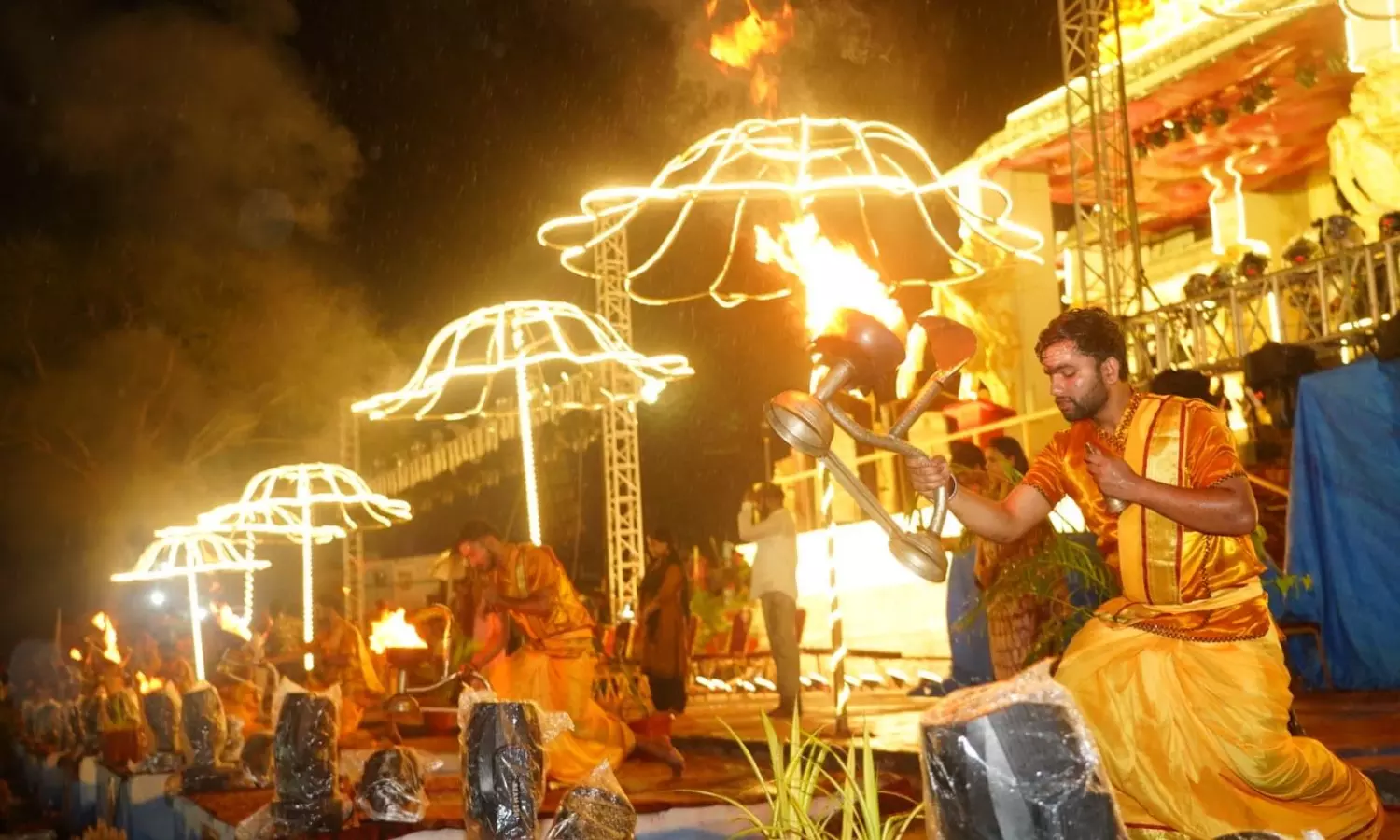 Pandits from Kashi perform ritual rooted in the Vedas; nine aartis performed at Kaleshwaram ghats