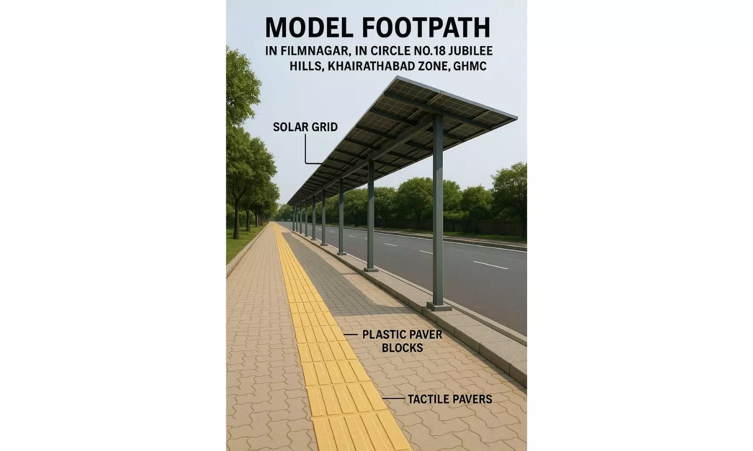 Hyderabad: The GHMC has initiated the development of a Model Footpath along the high-pedestrian corridor from Ramanaidu Studio at Road No. 79/82 Junction to BVB Junction at CVR Channel, Road No. 82, Jubilee Hills, falling under Circle-18, Khairathabad Zone.