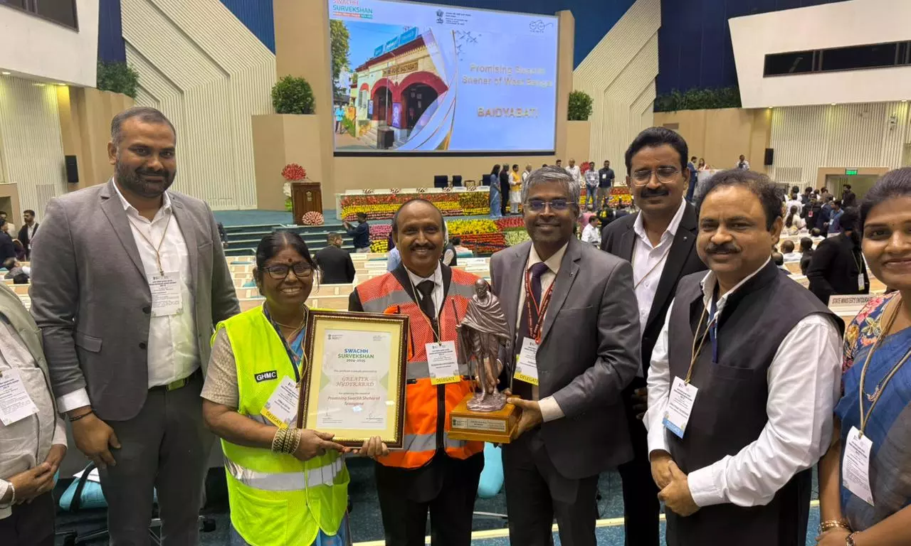 Frontline workers of the Greater Hyderabad Municipal Corporation participated in the Swachh Survekshan 2024–25 Award ceremony held at Vigyan Bhavan, New Delhi